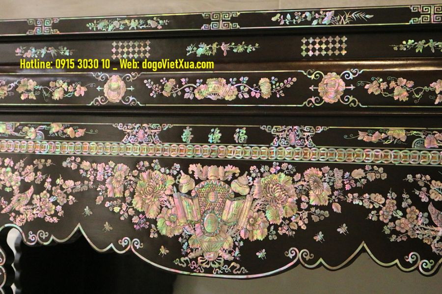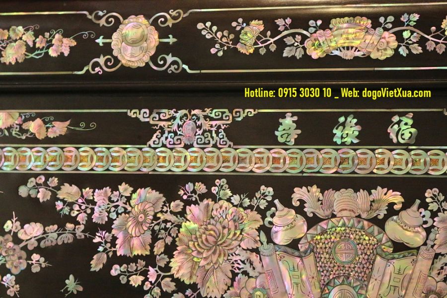 Hình ảnh tinh tế: Họa tiết làng quê, thiên nhiên, hoa văn truyền thống ( Cuốn thư, liễn đối, tứ linh Long - Lân - Quy - Phụng (Phượng), Mai Thọ, Liên Hoa,...) được khảm tỉ mỉ, làm nổi bật giá trị mỹ thuật và ý nghĩa tâm linh.