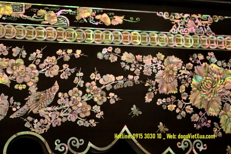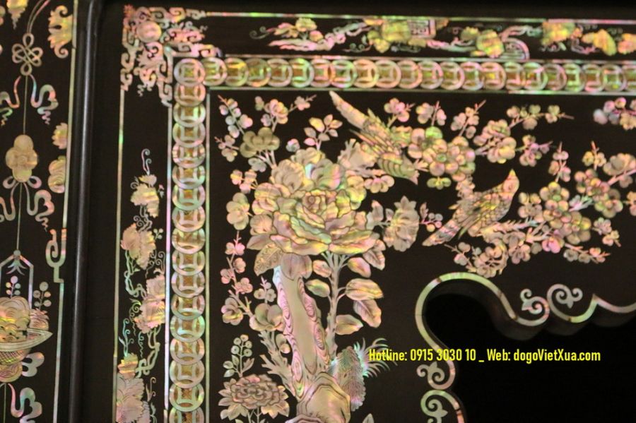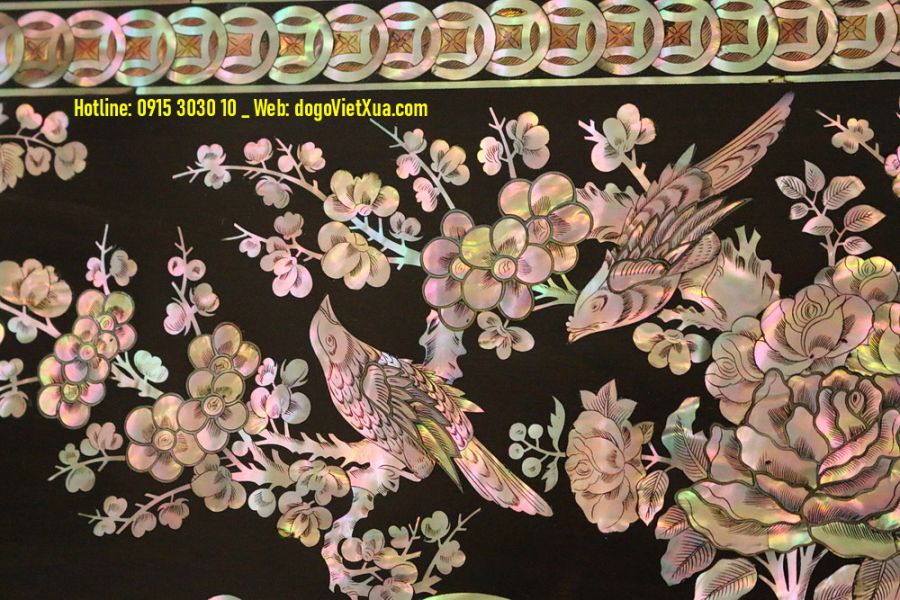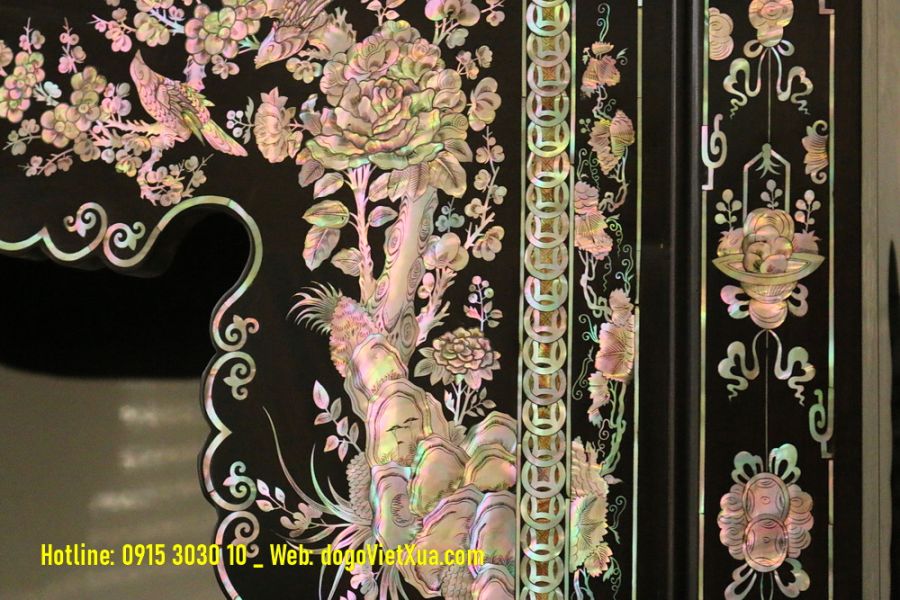 Nghệ thuật cẩn *************: Những miếng ốc được lựa chọn kỹ lưỡng từ vỏ trai ốc biển Singapore quý hiếm, ánh sắc bảy màu tự nhiên rực rỡ, kỹ thuật khảm thủ công tinh xảo tạo nên bức tranh sống động và có chiều sâu.