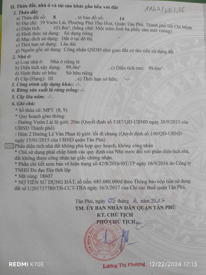 - Diện tích: 4x27m - Công nhận: 103,8m2