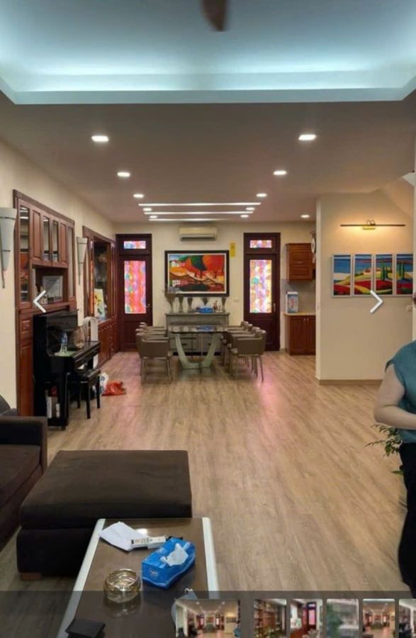 Nhà hướng mặt trời mọc, mặt tiền 5,5 m, mặt hậu 9,3 m. Nhà có 3 mặt thoáng và 1 khe thoáng. Diên tích theo sổ đỏ 114 m, xây 5 tầng, tổng diện tích sử dụng 460m, trước mặt nhà đỗ được 10 xe ôtô