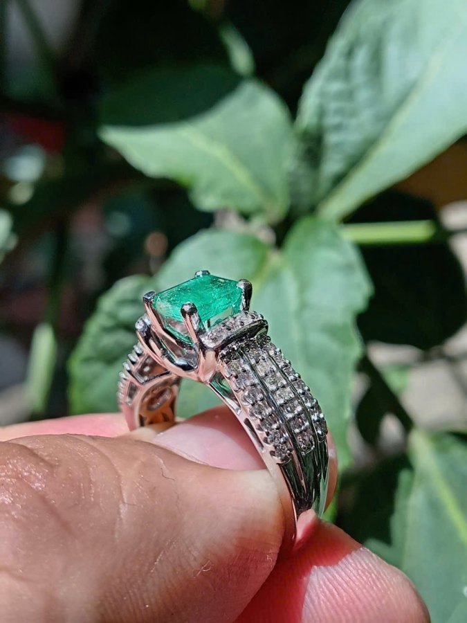 Nhẫn ngoại nữ vàng trắng 10k full kim cương tự nhiên 1ly2 chủ ngọc lục bảo tl 1chi51 size 19 giá trên