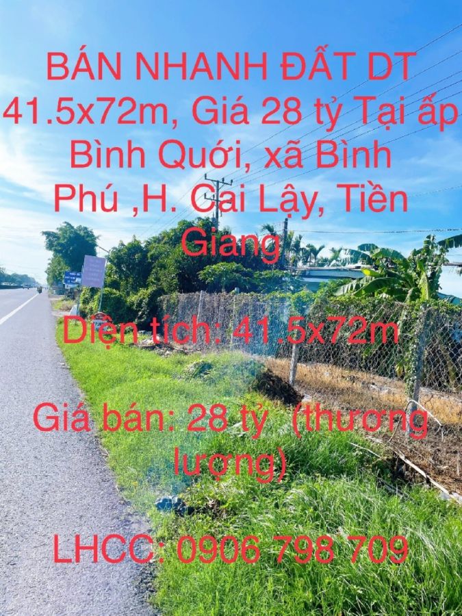BÁN NHANH ĐẤT DT 41.5x72m, Giá 28 tỷ Tại xã Bình Phú ,huyện Cai Lậy , Tiền Giang