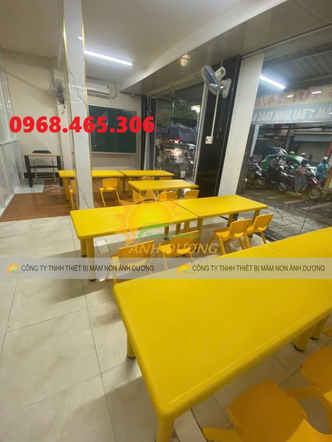 Bàn nhựa mầm non hình chữ nhật được làm hoàn toàn từ nhựa đúc, chắc chắn và bền theo thời gian, chân bàn được làm từ ống sắt, sơn tĩnh điện