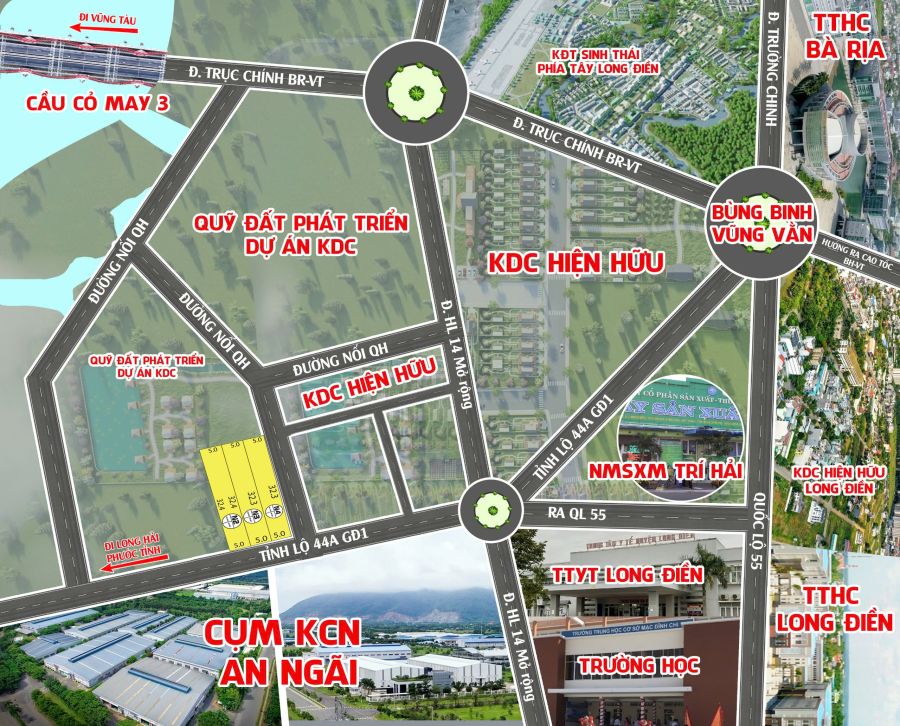 Vị trí 3 lô đất nằm gần cổng chào Long Hải MT TL 44A và đường nhựa trục đường chính đường về biển Long Hải, gần trung tâm hành chính của Huyện Long Điền.