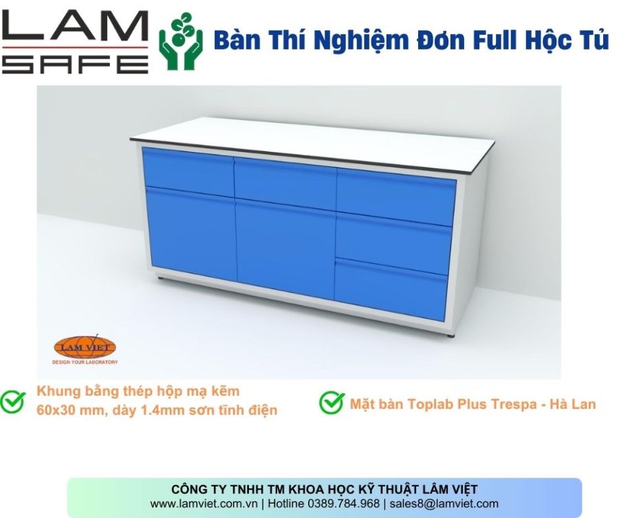 - Mặt làm việc: Được làm từ vật liệu Toplab Plus của hãng Trespa (Hà Lan), dày 16mm, có khả năng chống hóa chất, dễ dàng vệ sinh và giữ bề mặt sạch sẽ.