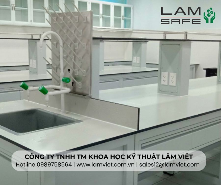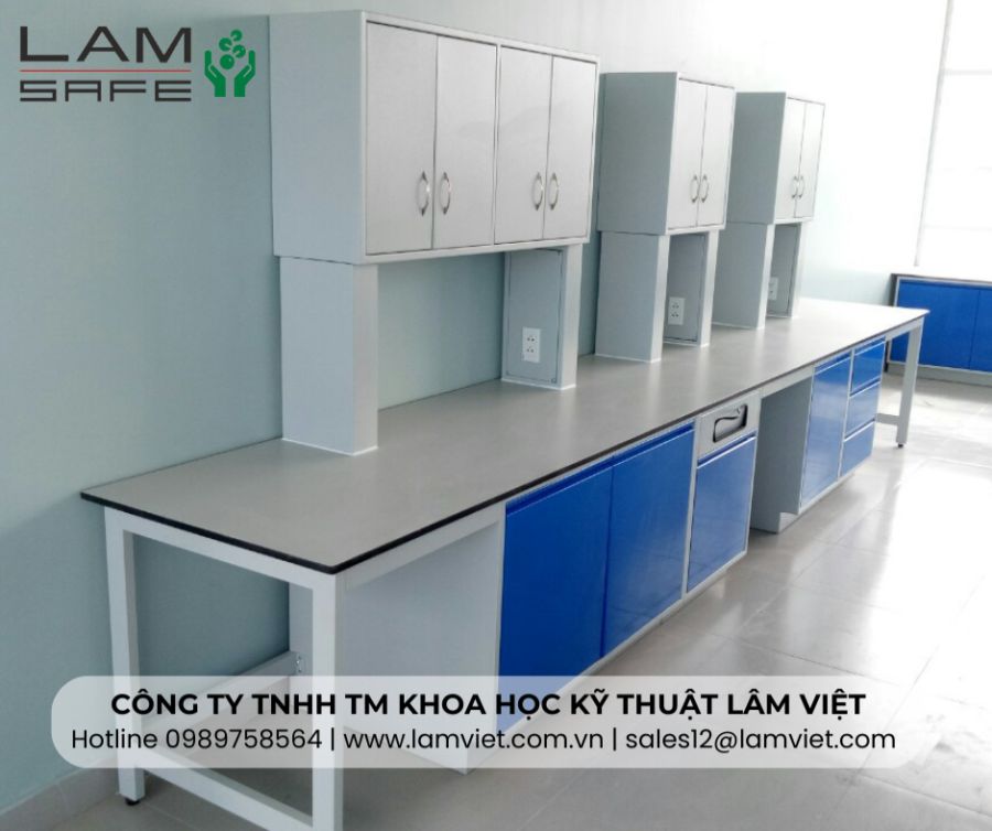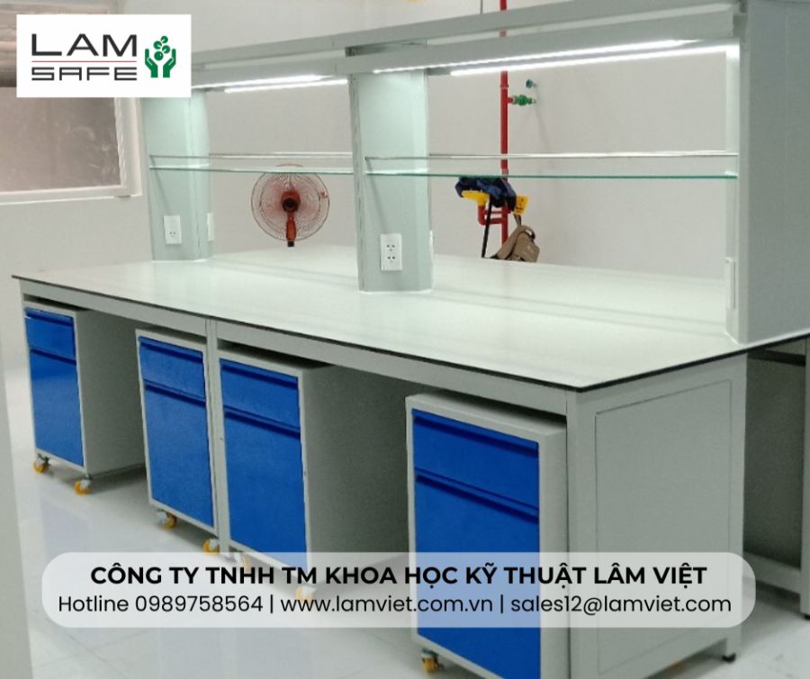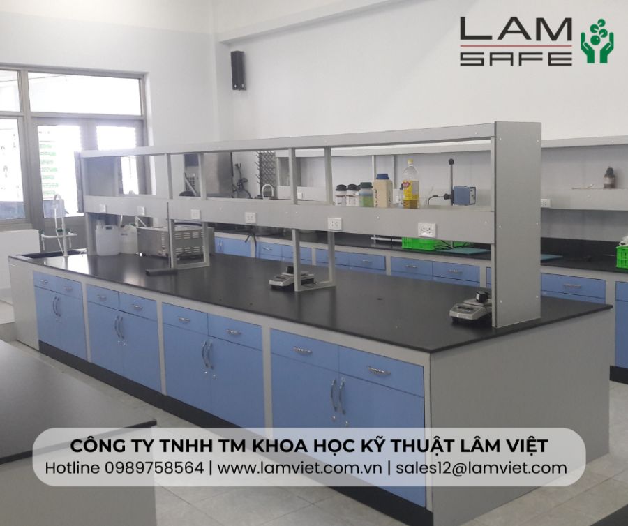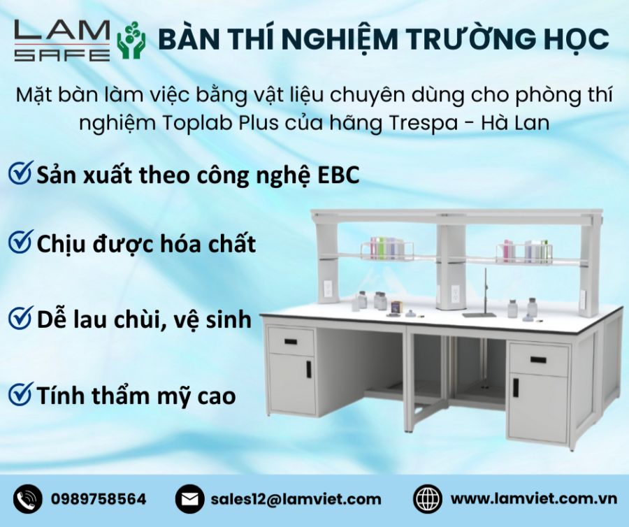 Bàn thí nghiệm với mặt bàn làm bằng vật liệu Phenolic chuyên dụng được nhập khẩu từ hãng Trespa - Hà Lan dày 16 mm.