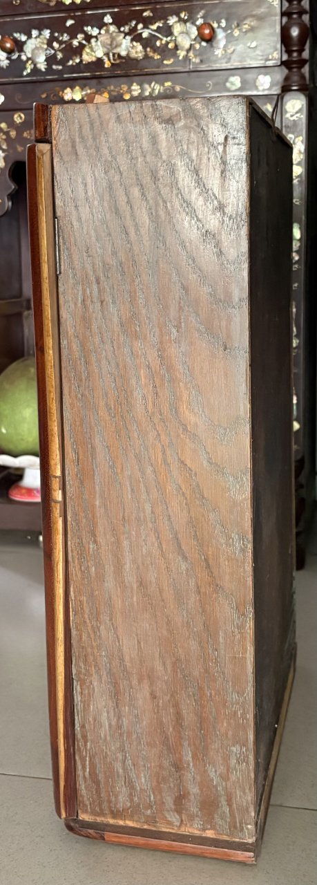 Kính dưới là kính mới. 2 bên khảm rất đẹp , thùng dạng cuốn thư nhìn rất là duyên
