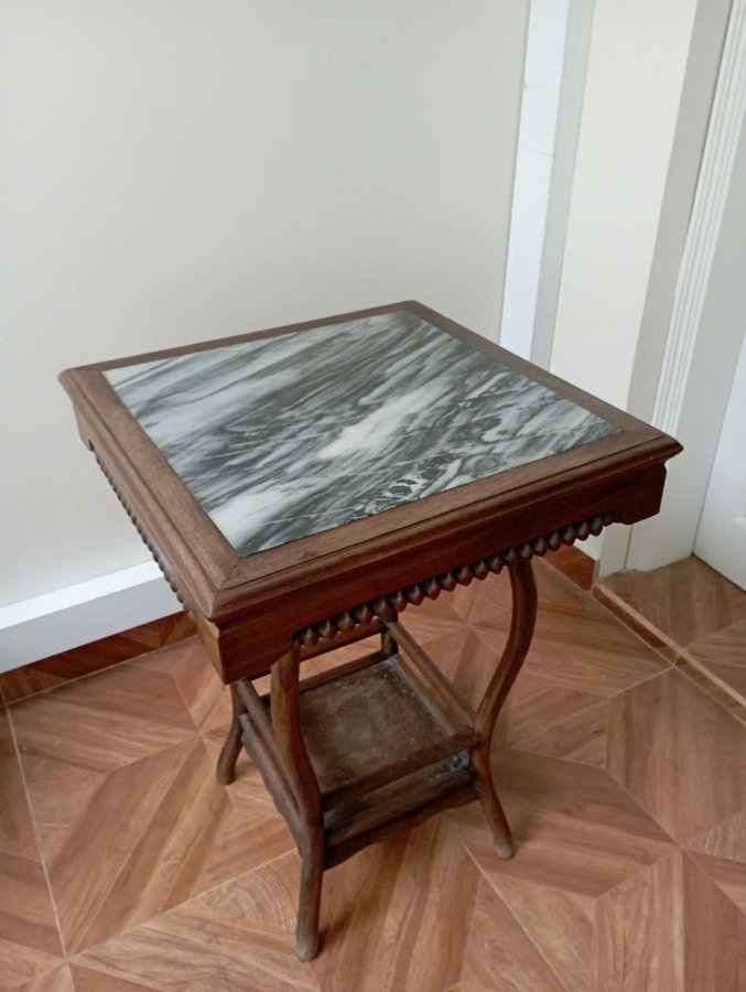 Bàn trà mặt vân đá có thể dùng chơi bài hoặc mạt chược, phong cách Á Đông. Tình trạng: đồ cũ đã qua sử dụng, gỗ già và chắc, chân bàn bị kênh nhẹ, chân và mặt bàn liên kết bằng đinh vít, mặt vân đá sờn cũ.