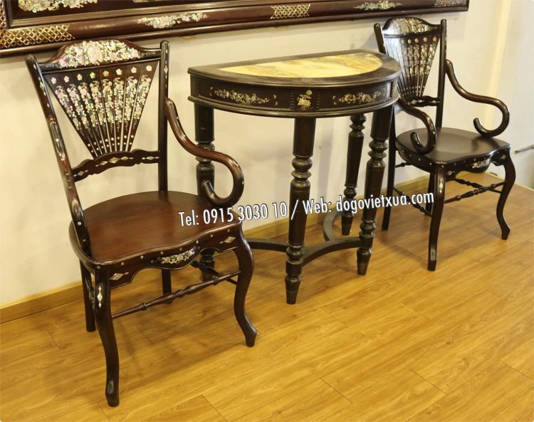 Ghế rẻ quạt: Dáng rất đẹp, nhẹ nhàng, mặt ghế là 1 tấm gỗ dày không nứt lẻ cong vênh. Cẩn xà cừ Nho Sóc, kỹ thuật khó Sen Lọng sử dụng nhiều rất công phu, tỉ mỉ kỳ công, chất ốc ở tầm cao quý hiếm .