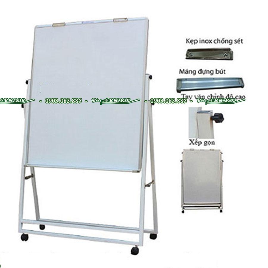 Bảng Flipchart với nguyên liệu mặt bảng nhập trực tiếp từ Hàn Quốc và được sản xuất theo công nghệ Châu Âu. Bảng Flipchart có gắn kẹp giấy, có bánh xe di chuyển, cho phép điều chỉnh độ cao và xếp gọn.