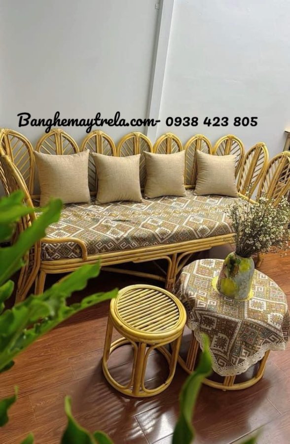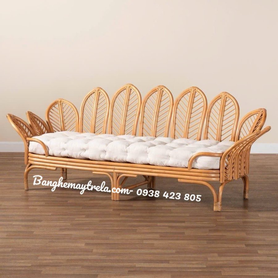 Băng ghế sofa mây hiện đại với thiết kế phần lưng ghế tạo hình từng chiếc lá mang đến vẻ đẹp độc đáo, vừa gần gũi thiên nhiên vừa sang trọng.
