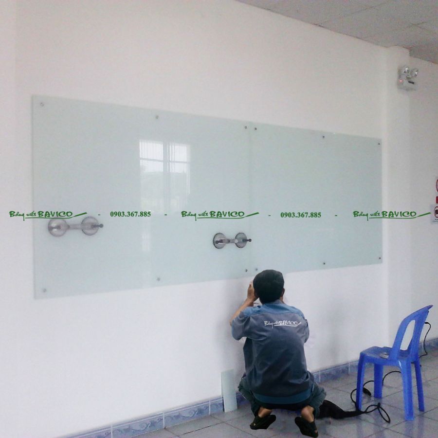 3. Thi công lắp đặt bảng vào tường: Bằng bulon inox (ốc kính), bảng có màu trắng sữa rất đẹp và thẫm mỹ và phù hợp với mọi không gian văn phòng sang trọng.