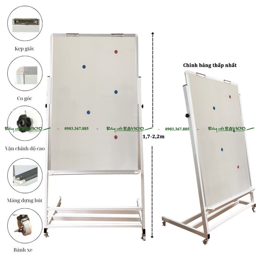 CHÂN BẢNG: Khung chân: Bằng sắt chống sét vuông 20x40mm, sơn tĩnh điện màu trắng hoặc màu đen chống sét, chống trầy. Đặc biệt, khung chân có thiết kế phần tai vặn cho phép điều chỉnh bảng theo chiều cao theo yêu cầu sử dụng. Có gắn 4 bánh xe Taiwan: Giúp di chuyển và có chốt cố định dễ dàng.