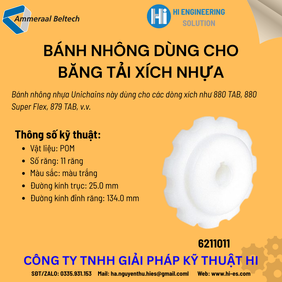 Trong các hệ thống băng tải công nghiệp, bánh nhông (sprocket) đóng vai trò quan trọng trong việc dẫn động xích và đảm bảo quá trình truyền động diễn ra chính xác, ổn định. Công ty TNHH Giải Pháp Kỹ Thuật HI xin giới thiệu dòng bánh nhông nhựa chuyên dụng cho băng tải xích nhựa, sản phẩm chất lượng cao từ Ammeraal Beltech – Unichain.
