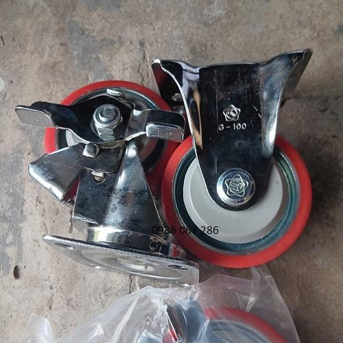 Bánh xe đẩy hàng PU lõi thép là loại bánh xe lõi thép bọc nhựa PU đỏ (vàng) tải trọng tối đa từ 200kg đến 450kg/ bánh xe , khả năng chịu tải của bánh PU lõi thép tốt nên bánh xe đẩy PU lõi thép thường sử dụng cho các mặt hàng tải trọng nặng. Bánh xe đẩy hàng Pu thép là đường kính bánh xe 100mm, 130mm, 150mm, 200mm độ dày bánh xe là 48mm đến 50mm, tổng chiều cao kể cả càng 245mm.