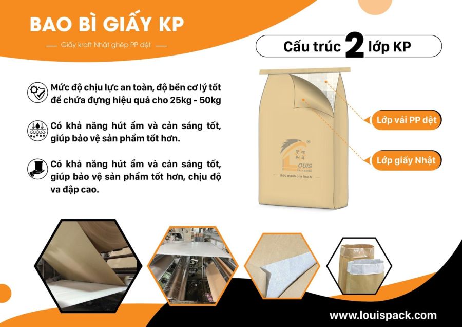 Bao giấy KP có được ưu điểm của cả 2 chất liệu với các đặc tính như: chịu lực tốt, tính cơ lý bền dai và chịu mài mòn tốt, đồng thời giấy Kraft có khả năng hút thấm ẩm cao và thân thiện với môi trường.