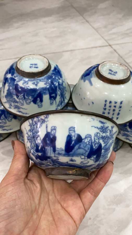 Bát đường kính 8cm bọc đồng vẽ trúc lâm thất hiền, bộ 10 bát