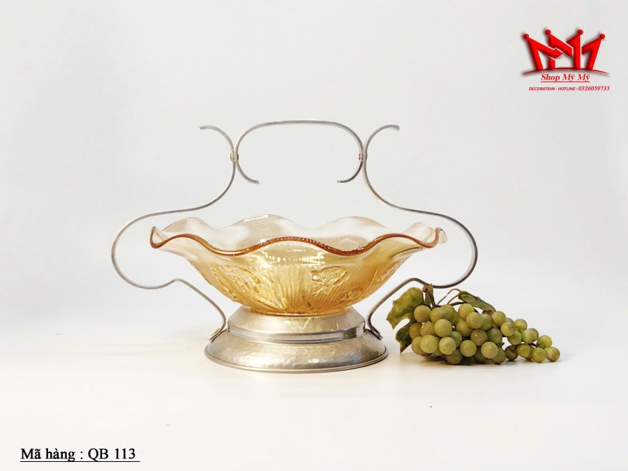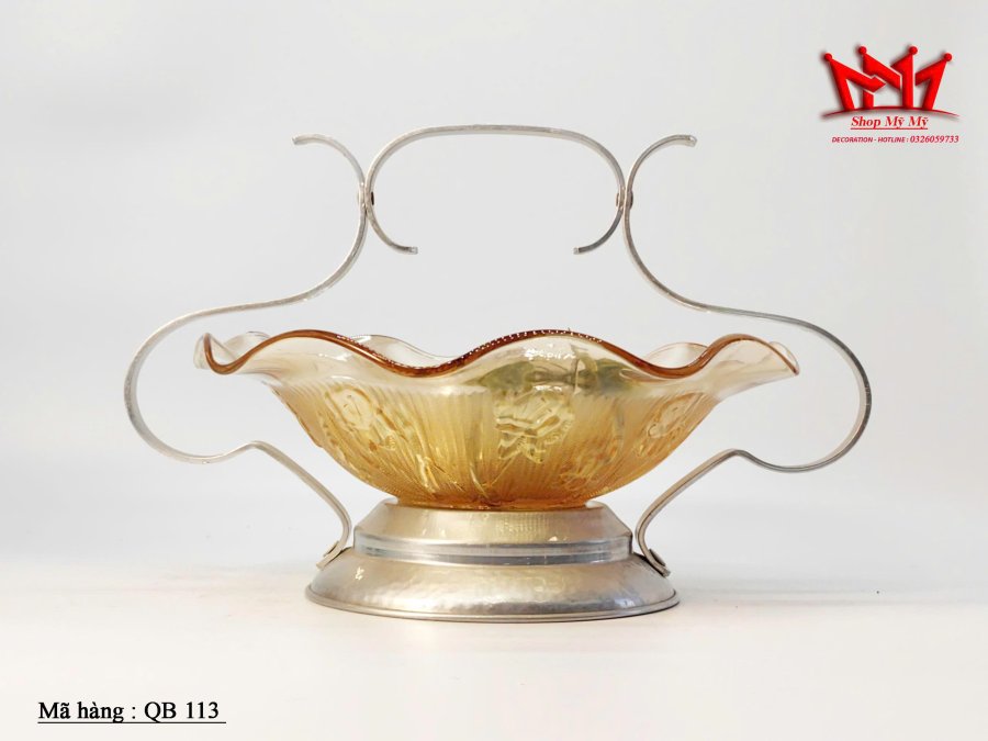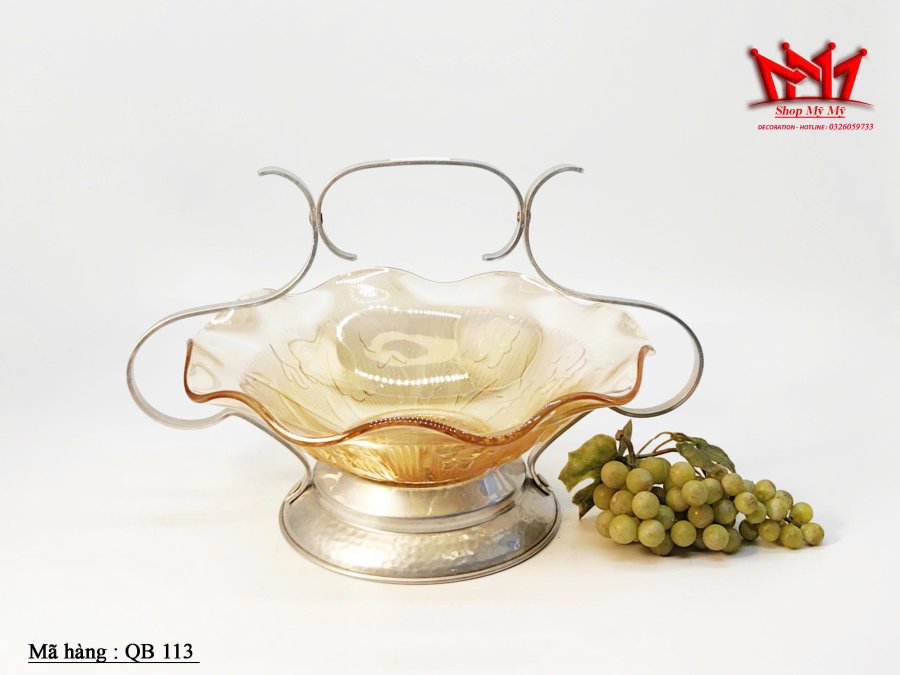 Bát hoa thủy tinh Carnival màu đào cổ điển có họa tiết nổi trên đế nhôm