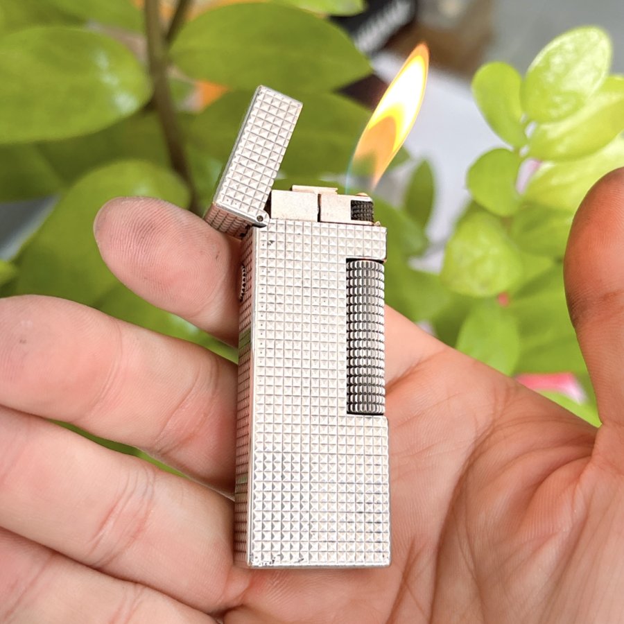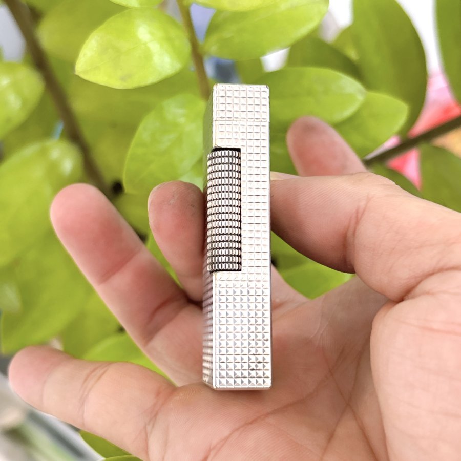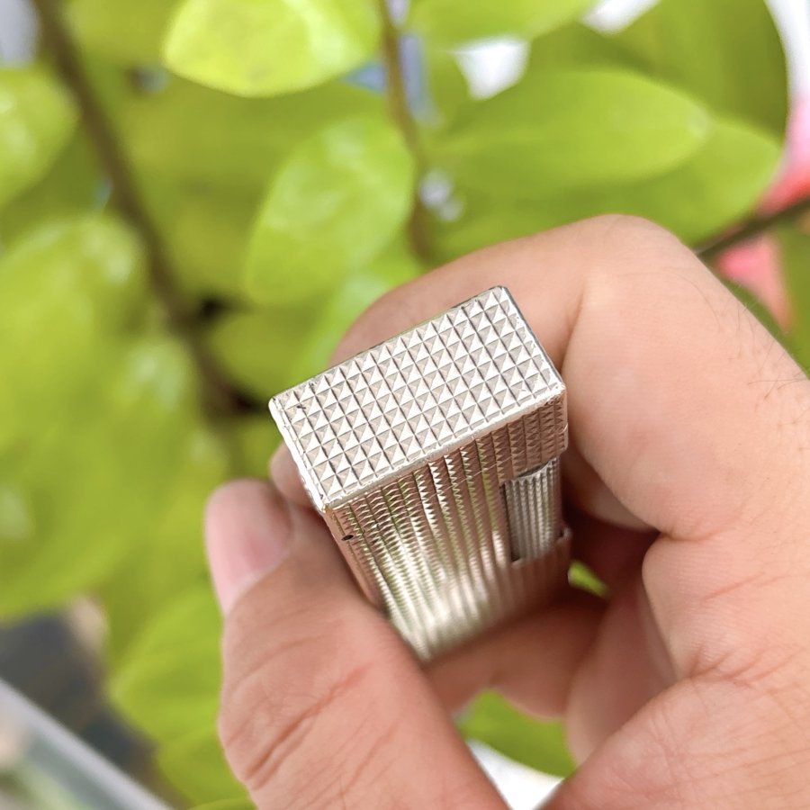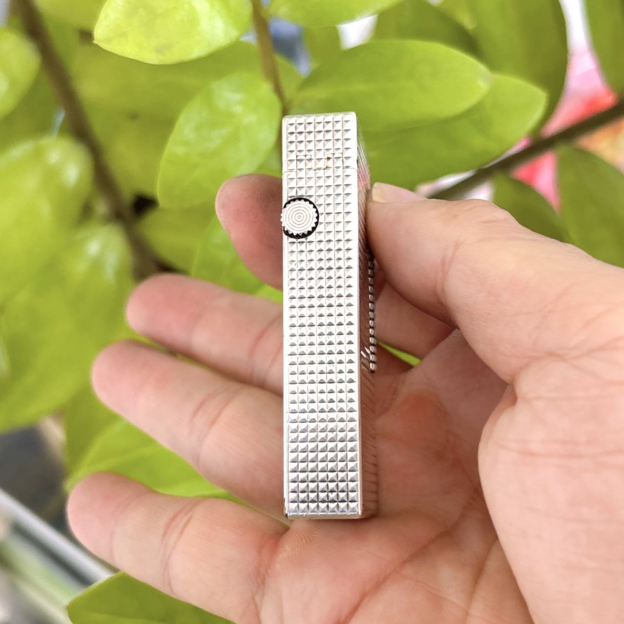 Bật lửa hiệu Dunhill chính hãng Thuỵ Sỹ sản xuất đẹp nguyên zin. Toàn thân lắc kê Bạc vân kim tự tháp đẹp, đáy có đóng Dunhill USRE 24163 PATENTED made in Switzerland.