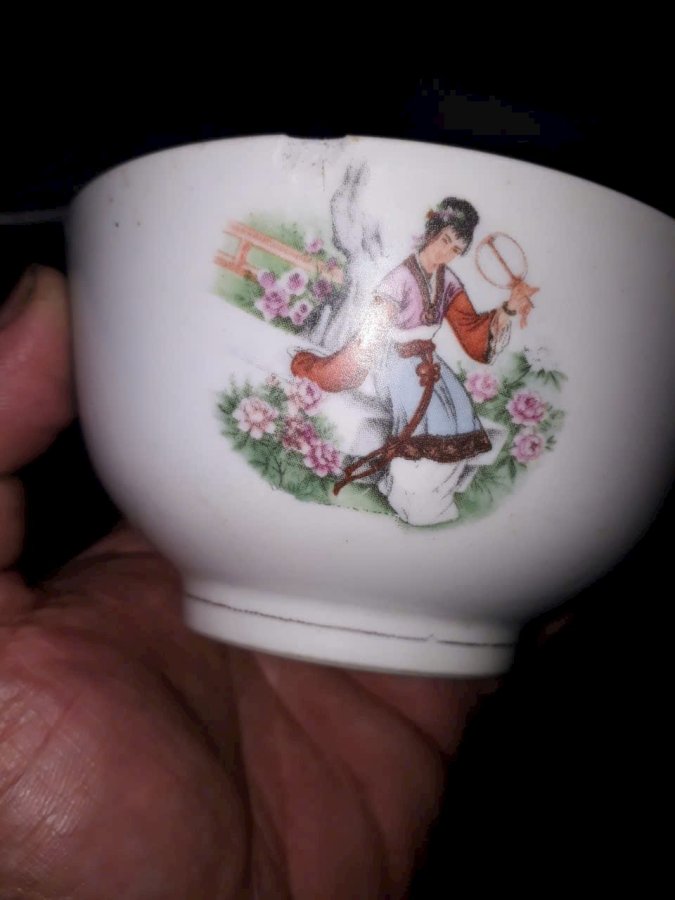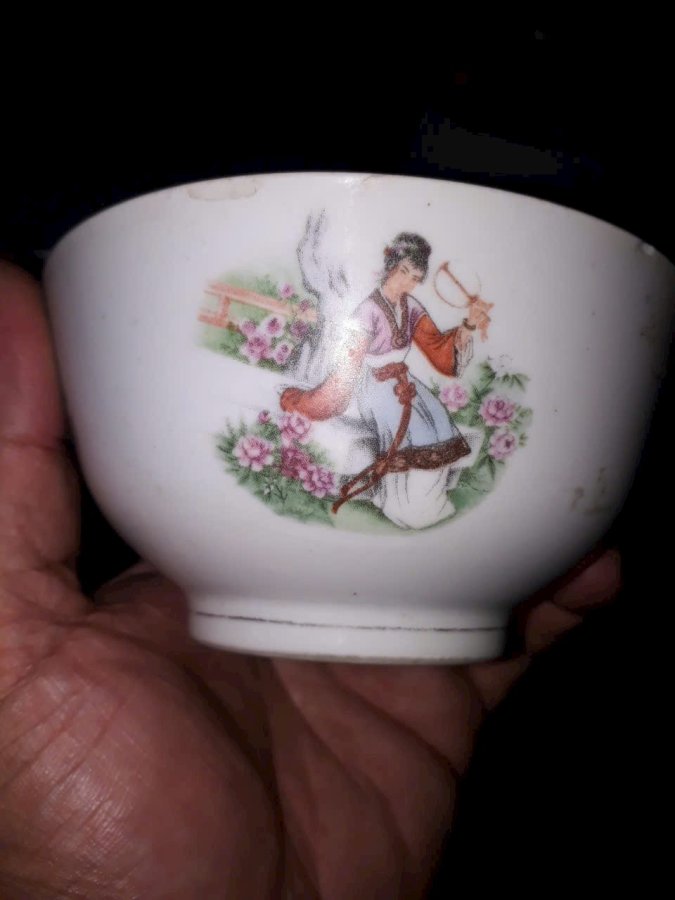 Bát con sứ tầu thời bao cấp vẽ 4 cô tiên nữ trong tiểu thuyết hồng lâu mộng. Vảy ít miệng, còn lại lành đẹp.