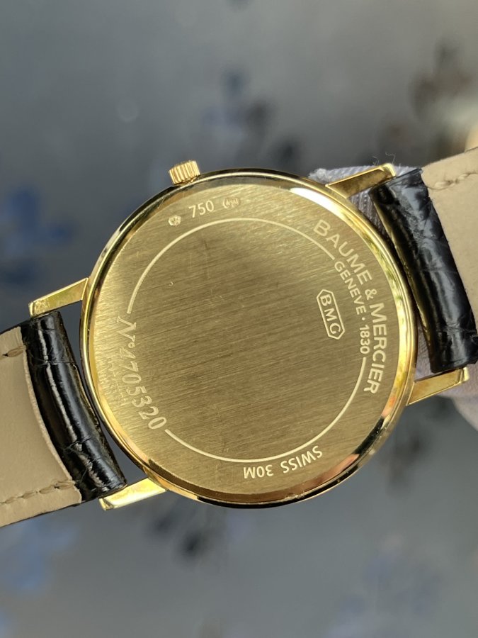 • Dây: Dây da đen + khóa gài mạ vàng Baume & Mercier