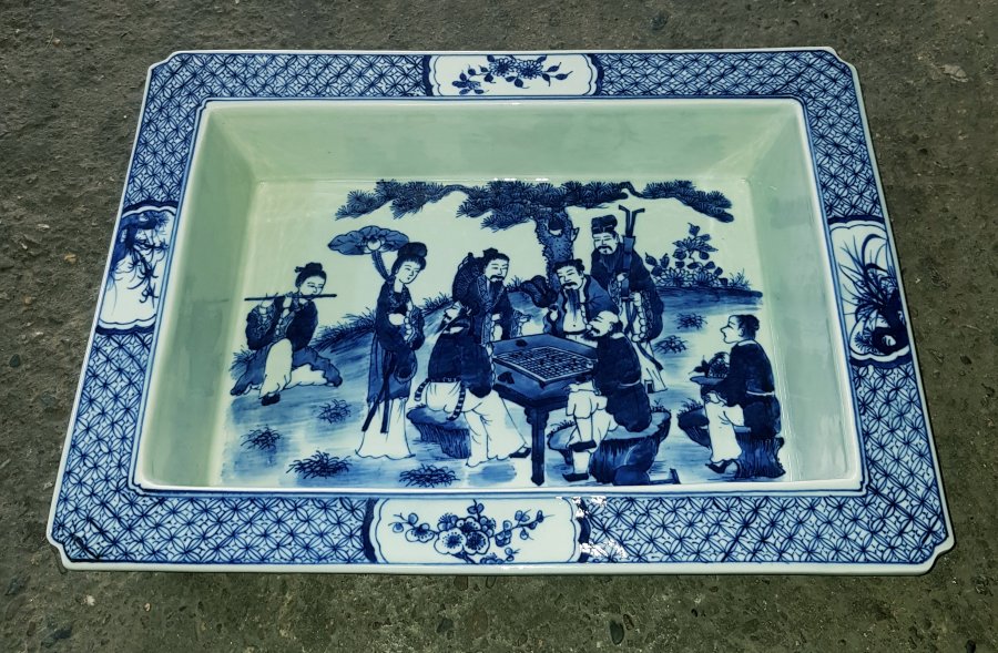 Bể cạn sứ kích thước lớn với họa pháp vẽ bát tiên phía trong lòng còn trên bề mặt thành bổ ô tứ quý mai lan cúc trúc. phía ngoài họa sơn thủy. Bể cạn rất nặng có kích thước phủ bì dài 40cm rộng 28.5cm. cao 8cm. lọt lòng dài 32.5cm. rộng 20cm lành lặn GL3850k