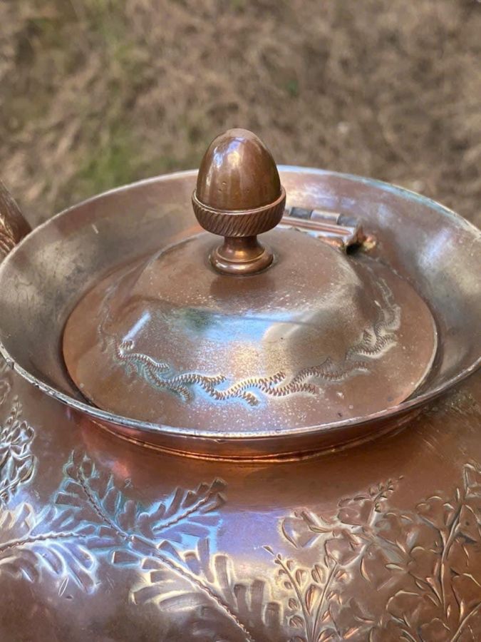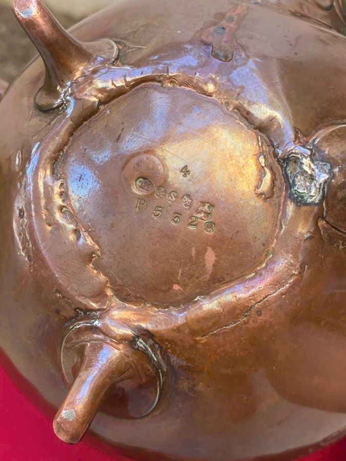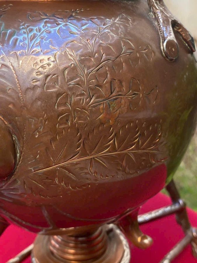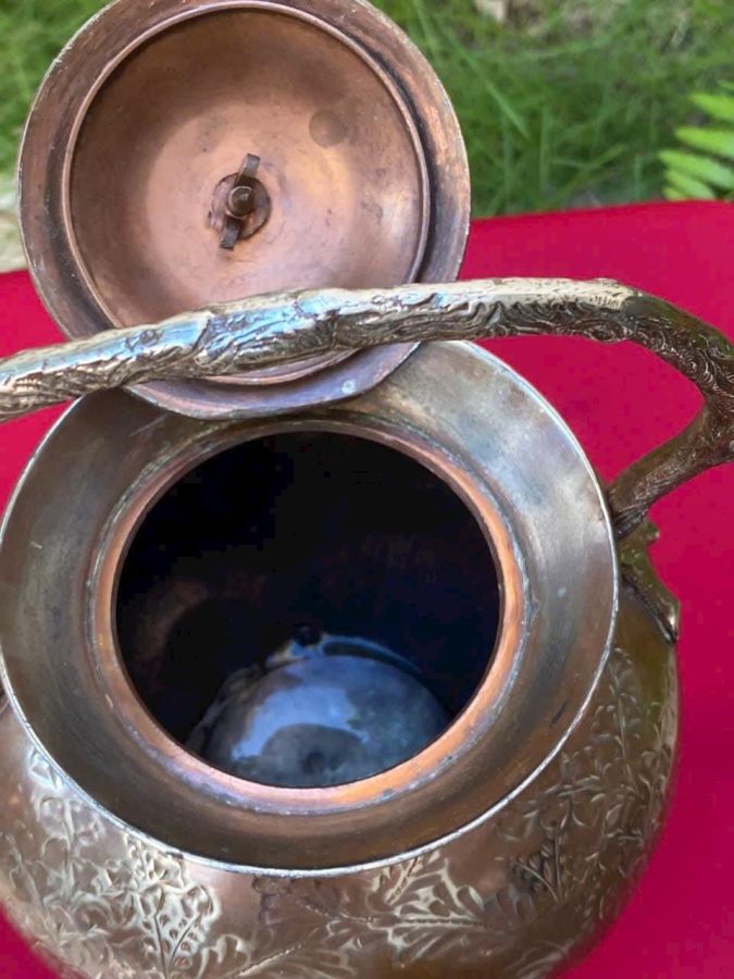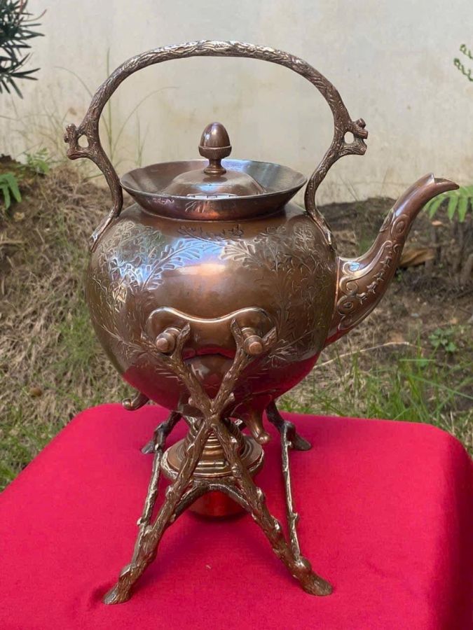Ấm hâm nước giữ nóng, dùng uống trà, caffe Hàng xưa của châu Âu Bằng đồng đỏ mạ bạc, hoa văn cực đẹp Sử dụng dầu Hàng hãng Nổi tiếng có đóng mã số và tem biểu tượng