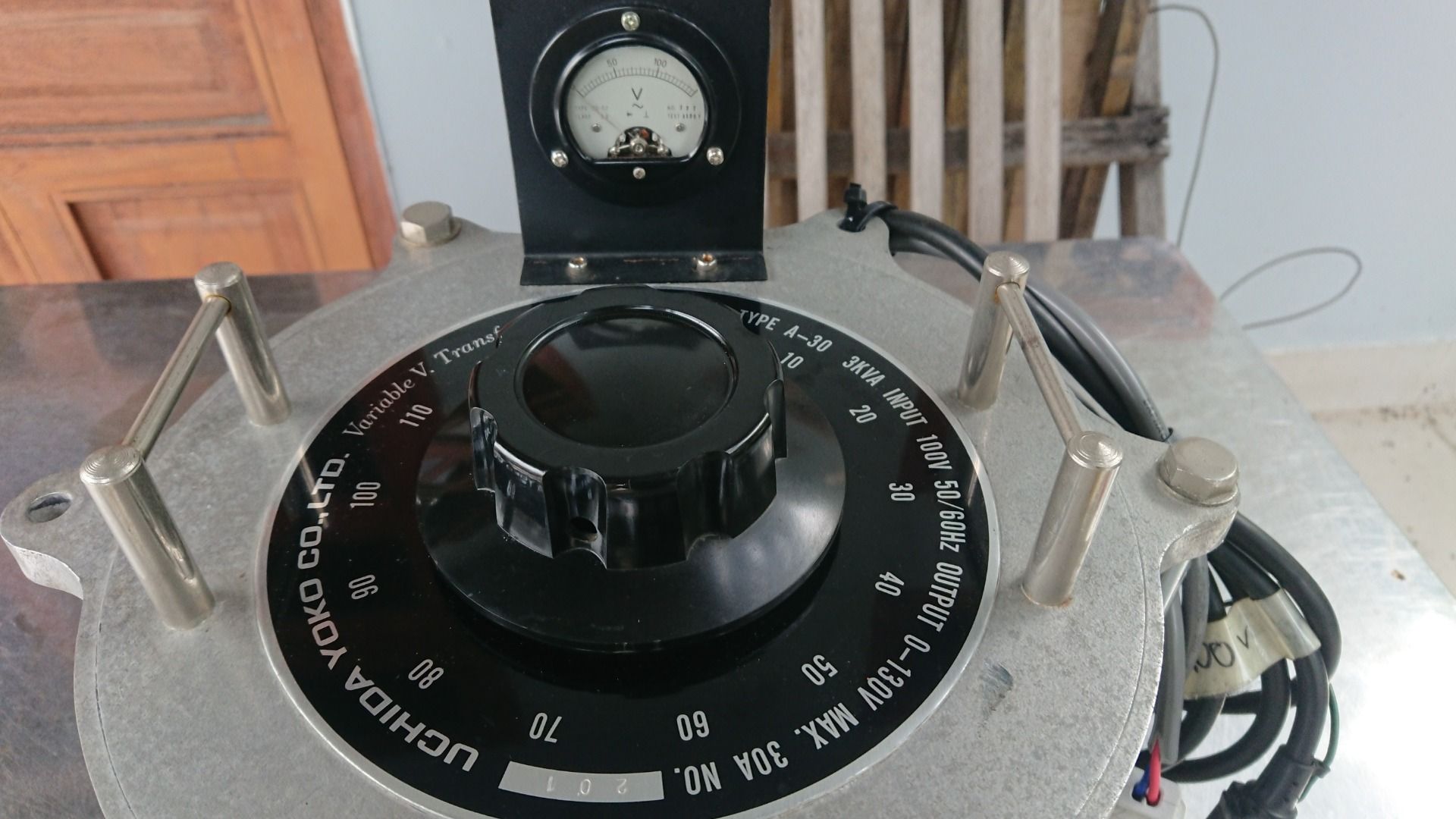Biến áp vô cấp Nhật, công suất 3kva, nặng 18kg, điện vào 100v, điện ra 130v, thích hợp cho các bác dùng để điều tốc mô tơ, máy cắt, máy mài thành máy tua chậm, điều chỉnh điện trở đốt nóng, biến áp còn rất mới và đẹp.