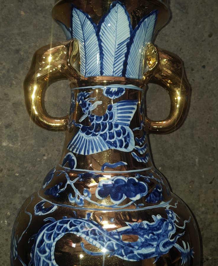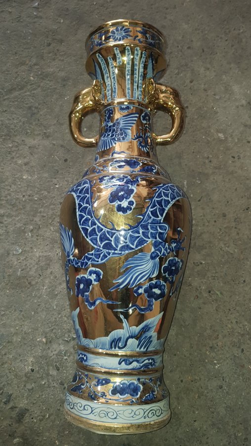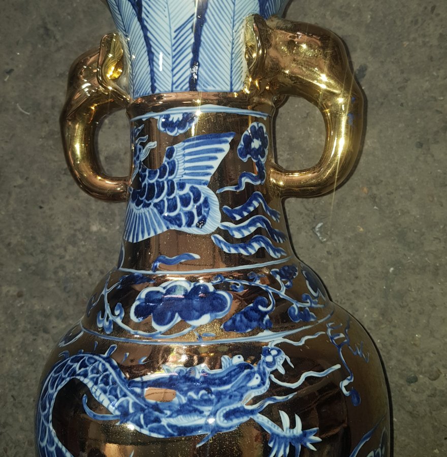 Bình đại cục vẽ rồng dát vàng có minh văn , song nhĩ là 2 lão tượng ngự . Bình cao tổng thể 66cm. vòng bụng 75cm. lành lặn. GL4550k