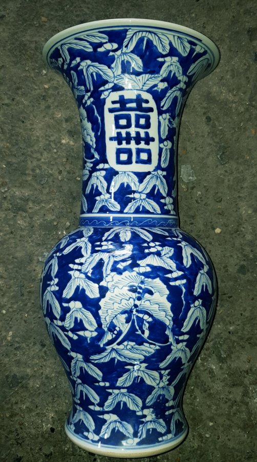 Bình xưa dáng Bá Huệ Tôn song hỷ đồ. Bình chàm tươi men lam dáng cân đối mỹ thuật. Cao tổng thể 41cm. vòng bụng 62cm. miệng 19cm. lành lặn. GL2950k