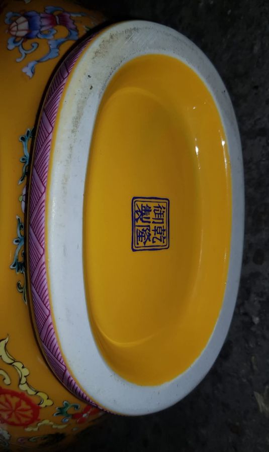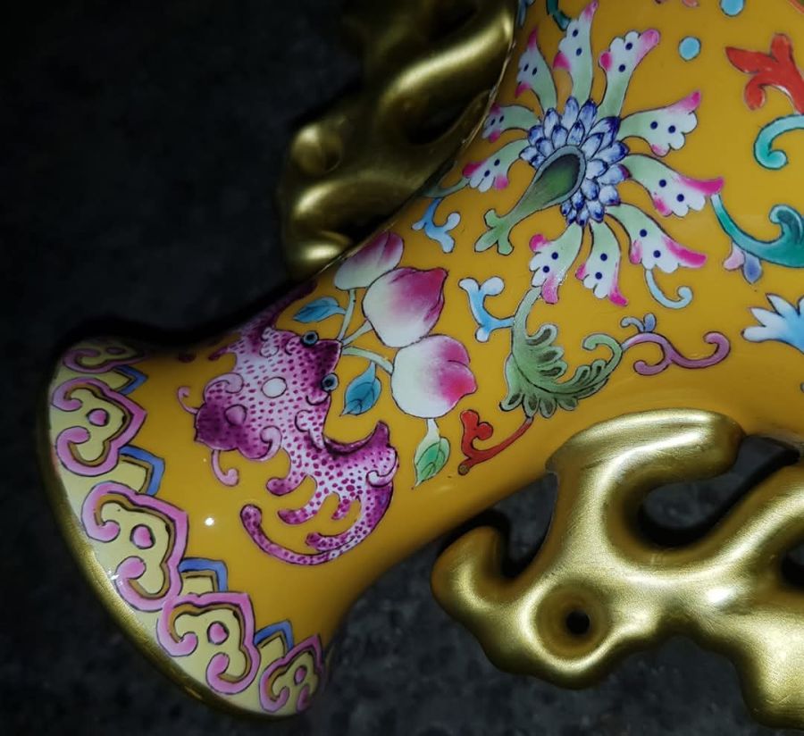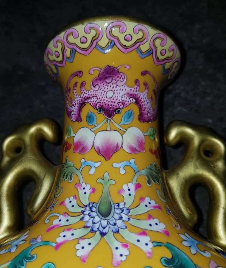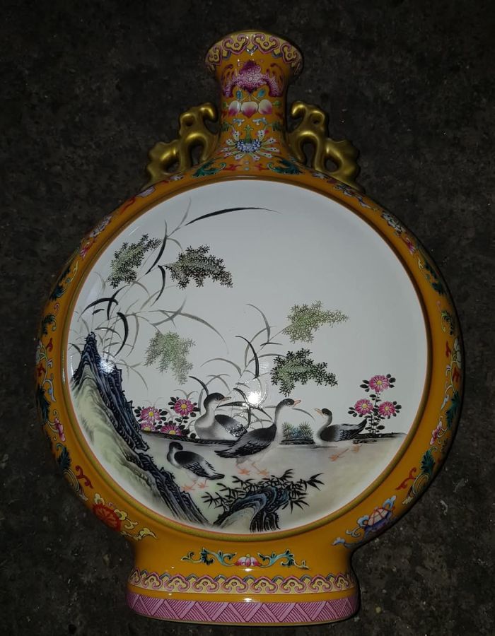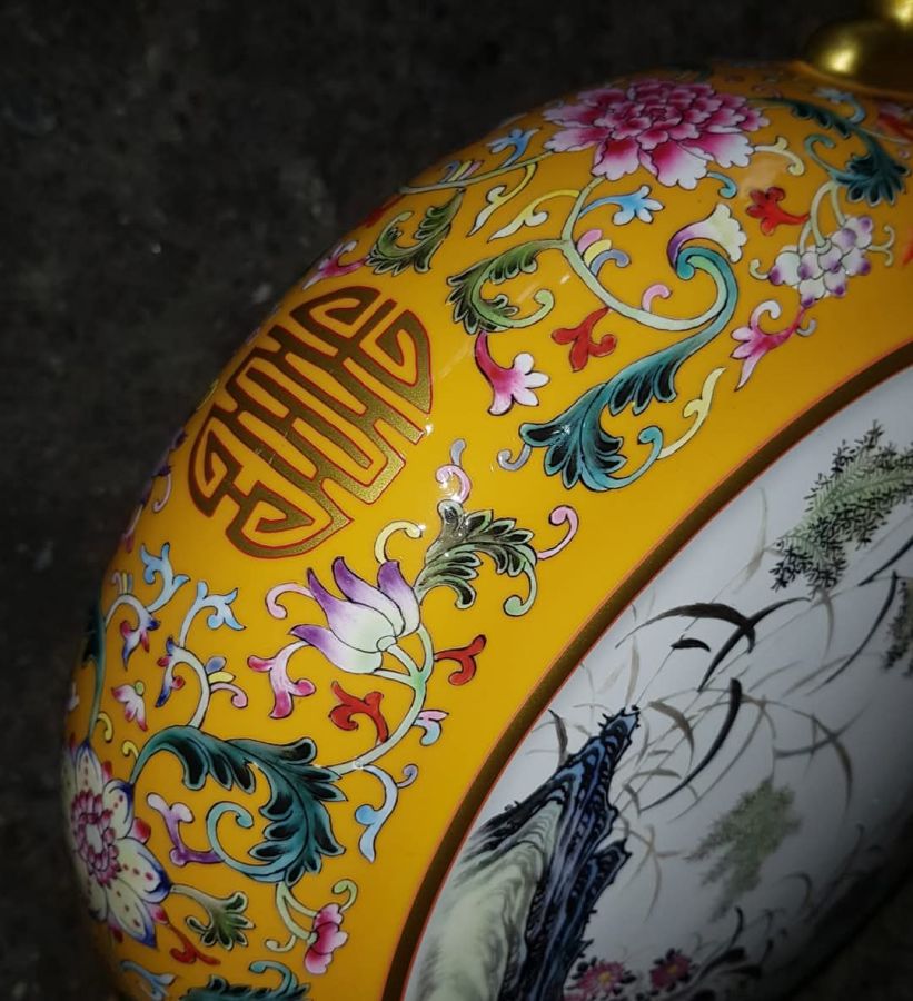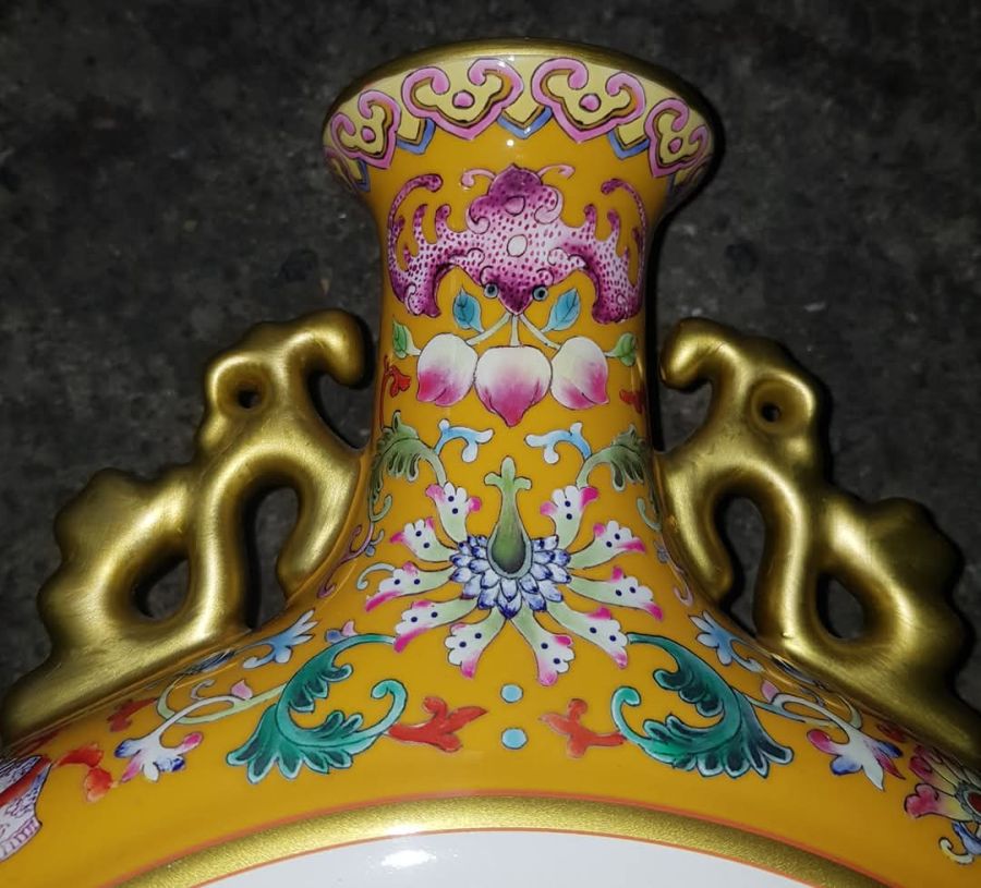 Bình dáng đồng hồ bổ ô 2 mặt. 1 mặt là Song hạc thọ đào , 1 mặt là phi minh túc thực với rất nhiều tầng hoa văn , xoài xích và các họa tiết gấm nổi xung quanh tạo nên tác phẩm hài hòa về mọi khía cạnh. Bình cao 39cm.đường kính mặt 30cm. dầy 10cm. GL2850k