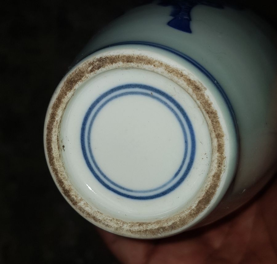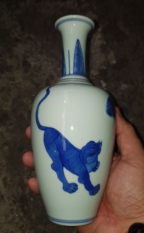 Bình dáng hiếm họa pháp Tam Thú Đồ cao 21.5cm. vòng bụng 29.5cm. Lành lặn men chàm sâu già lửa. GL1250k
