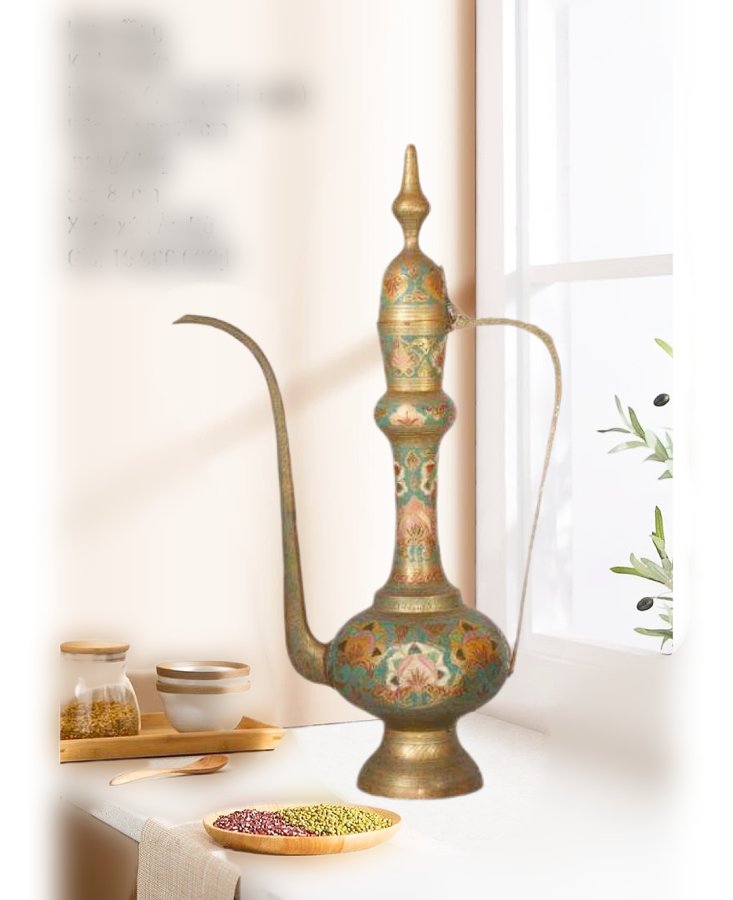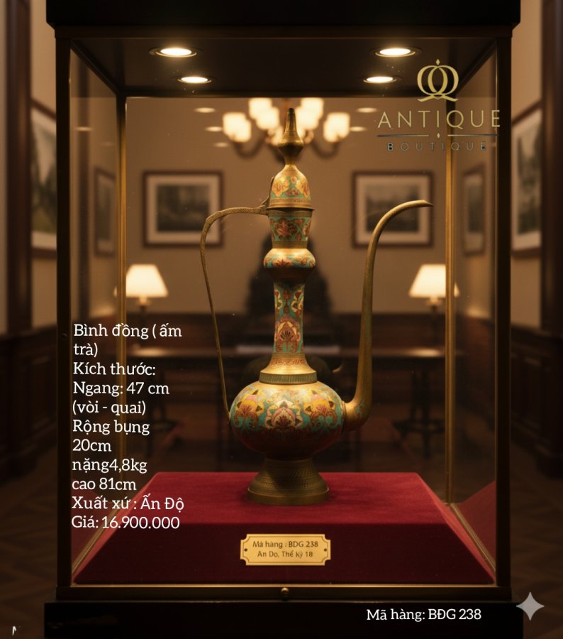 Bình đồng pháp lam (ấm trà). Kích thước:Ngang: 47 cm (vòi - quai). Rộng bụng 20cm, nặng4,8kg cao 81cm. Xuất xứ: Ấn Độ