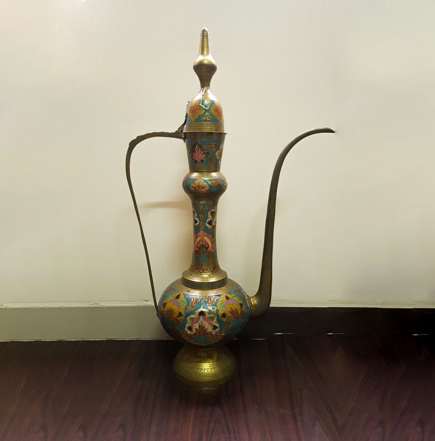 Bình đồng thau Ấn Độ cổ điển lớn có men khắc và họa tiết hoa màu.