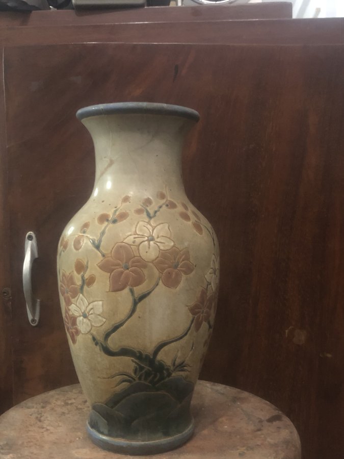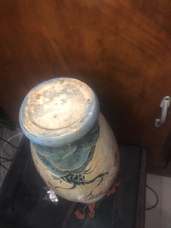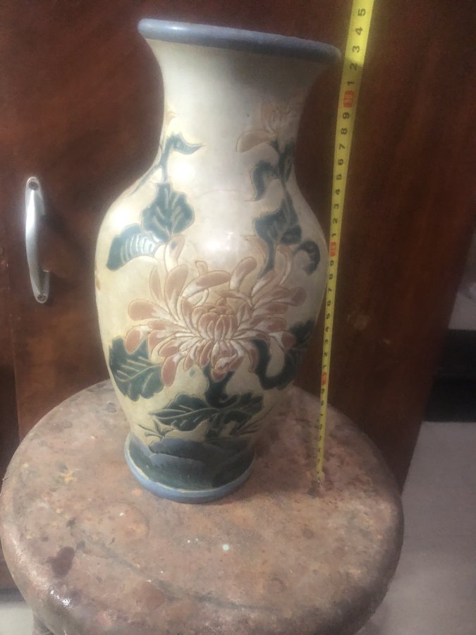Bình gốm BH xưa, cao 33, đk miệng bình 12cm vòng bụng 56cm, hoạ tiết hoa lá rất đẹp, bị tóc nhẹ trên miệng như hình. Ace có nhu cầu cui lòng nt hoặc alo. Cám ơn mọi người đã quan tâm!