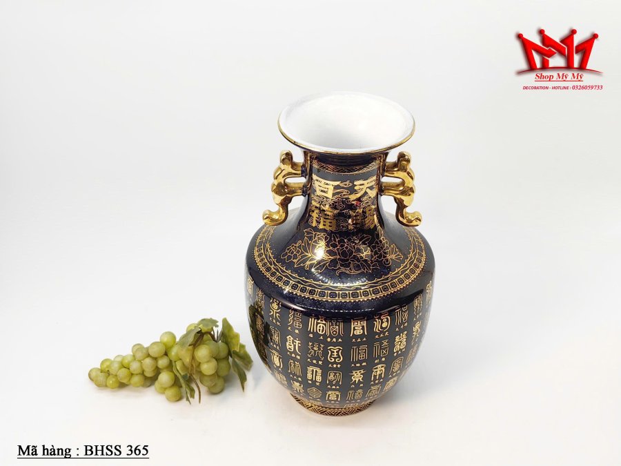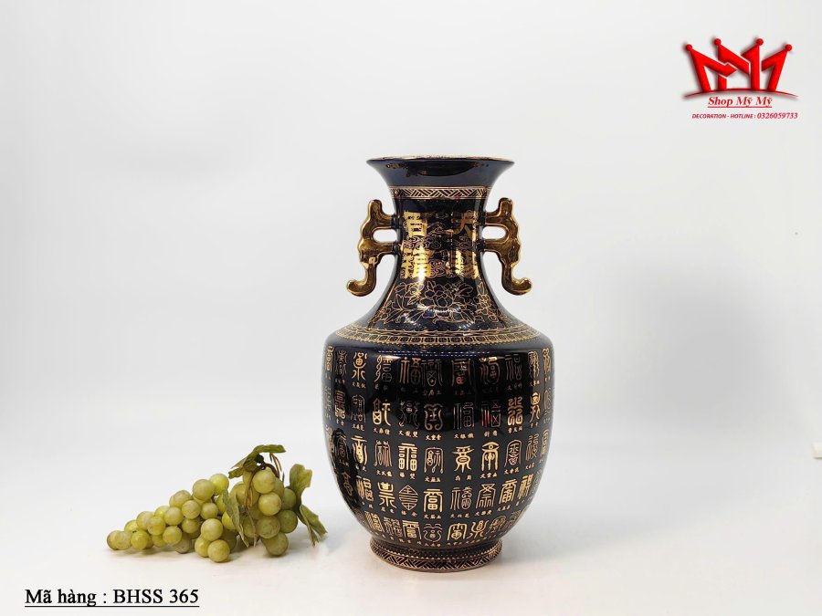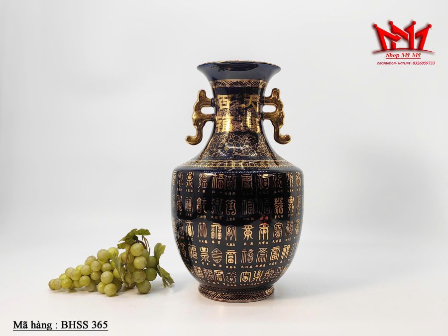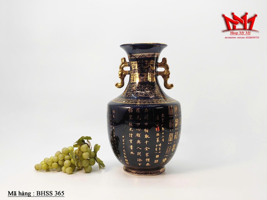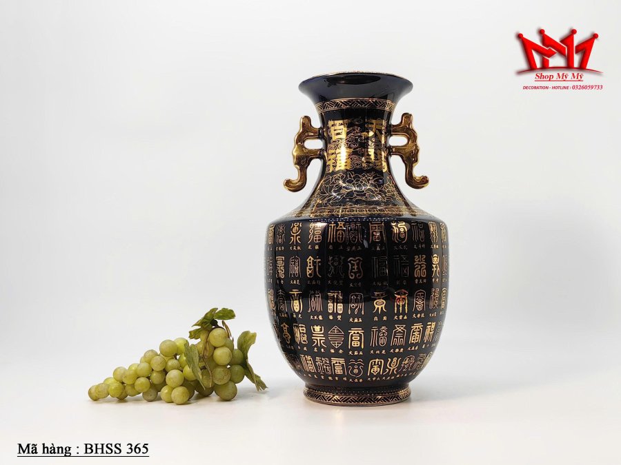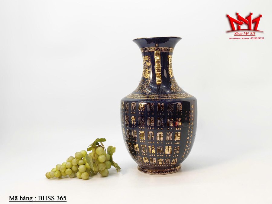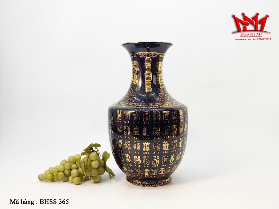 Bình hoa cổ điển Trung Quốc màu xanh colbalt tay cầm mạ màu vàng, chữ, trang trí.