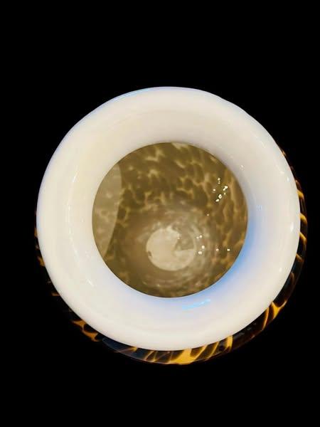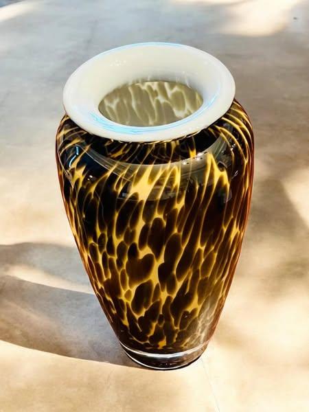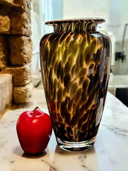 Bình hoa có thiết kế mai rùa, đặc trưng bởi các họa tiết xoáy màu nâu, hổ phách và đen