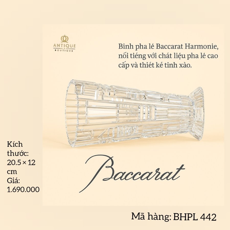 Binh pha lé Baccarat Harmonie, nói tiếng với chát liệu pha lê cao cấp và thiết kế tinh xảo. Kích thước: 20.5 x 12 cm. Giá: 1.690.000. Mã hàng: BHPL 442