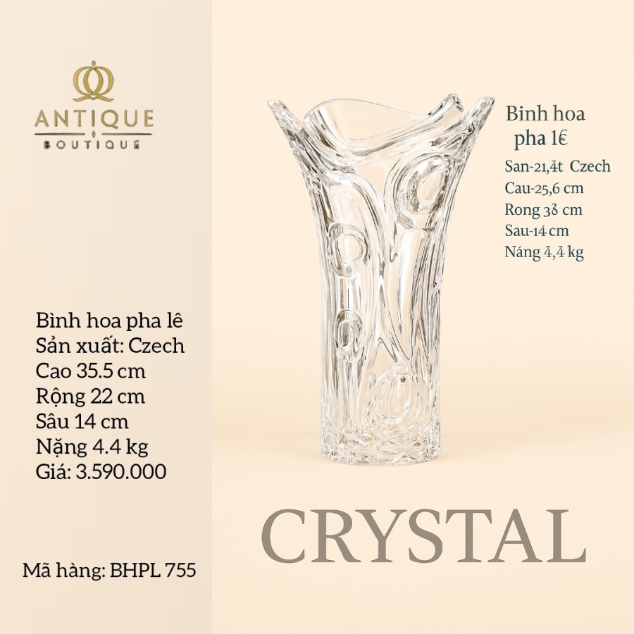 Bình hoa pha lê. Sản xuất: Czech. Cao 35.5 cm. Rộng 22 cm. Sâu 14 cm. Nặng 4.4 kg. Giá: 3.590.000