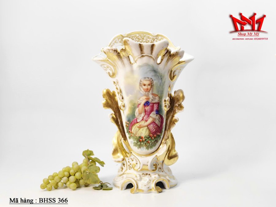 Chiếc bình hoa sành sứ cao cấp mang đậm dấu ấn nghệ thuật Victoria, nổi bật với hình ảnh chân dung quý bà được vẽ tay tinh xảo và những chi tiết trang trí mạ vàng phong cách Baroque đầy sang trọng.