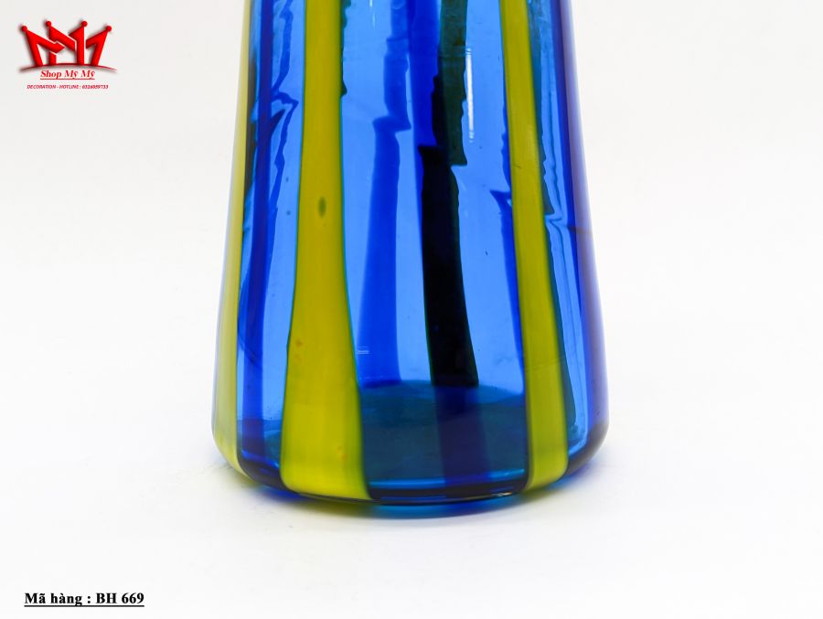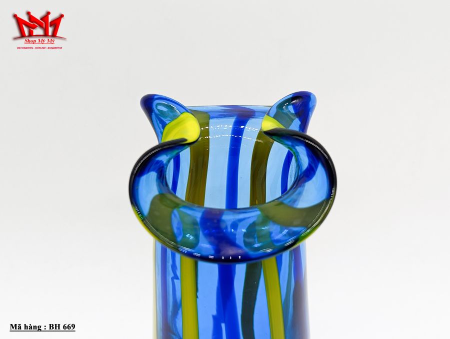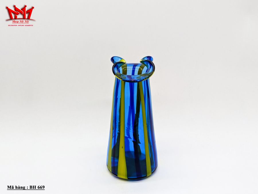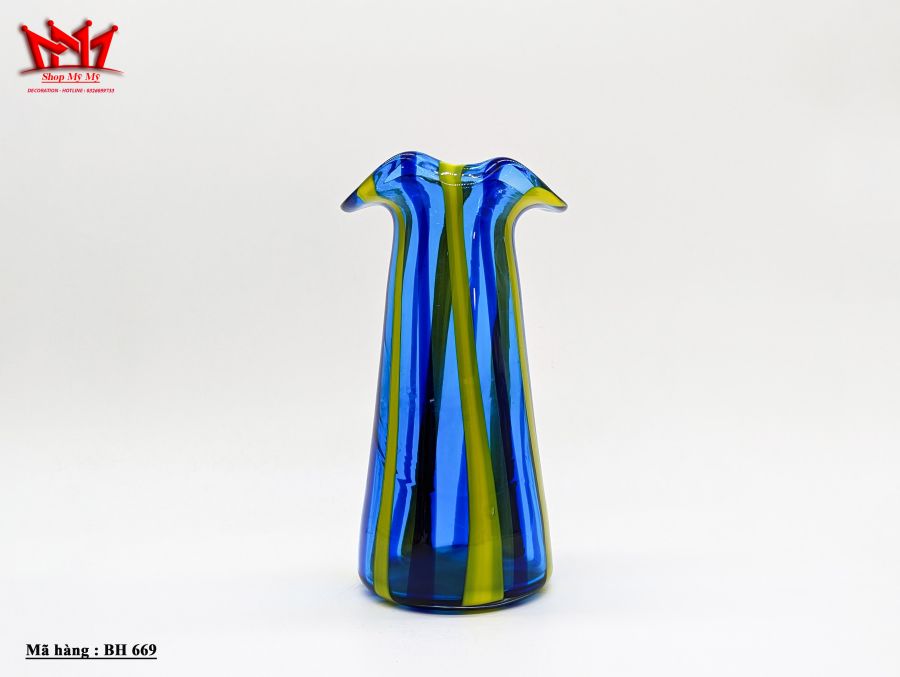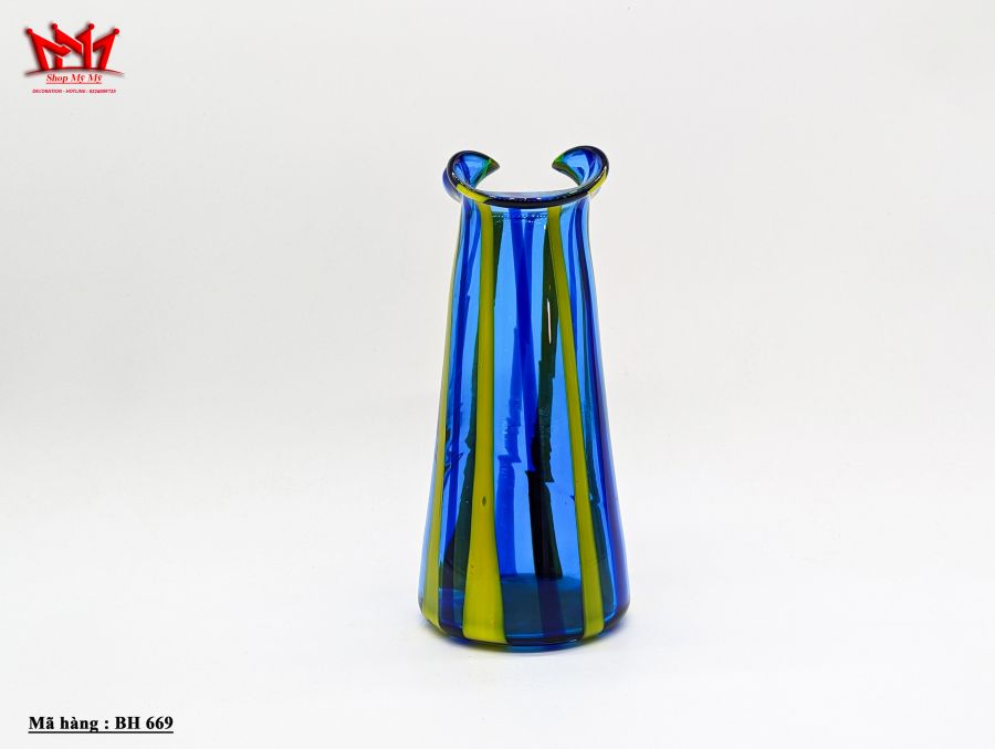 Bình hoa thủy tinh cổ điển màu xanh sọc vàng miệng uốn đẹp mắt