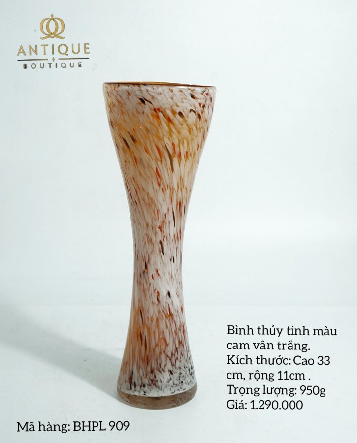 Bình thủy tinh màu cam vân trắng. Kích thước: Cao 33 cm, rộng 11cm.Trọng lượng: 950g Giá: 1.290.000. Mã hàng: BHPL 909