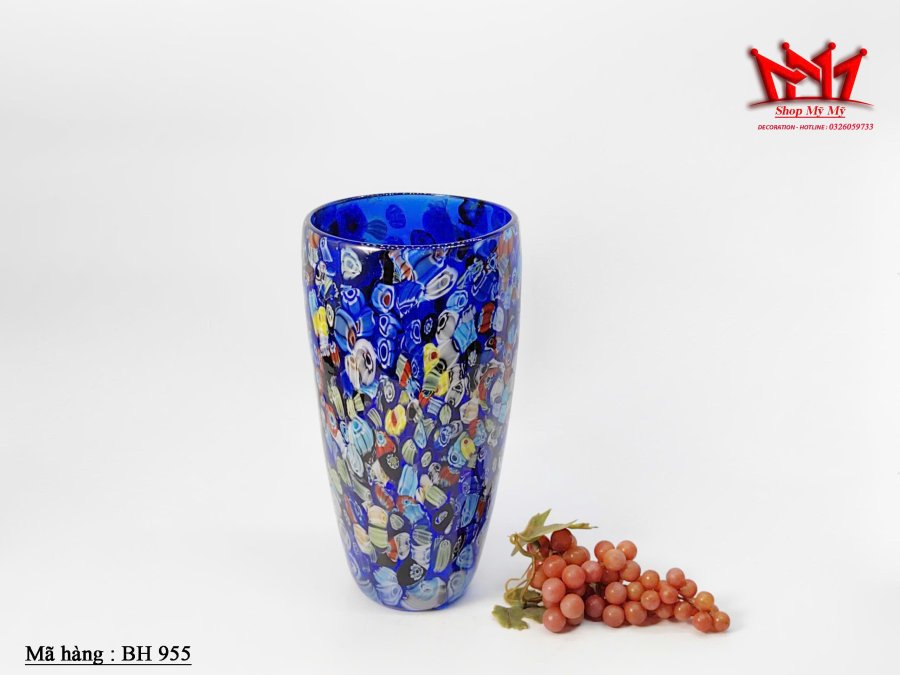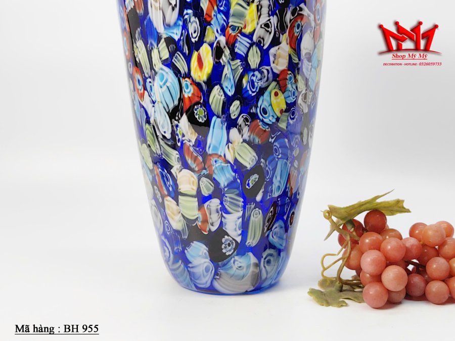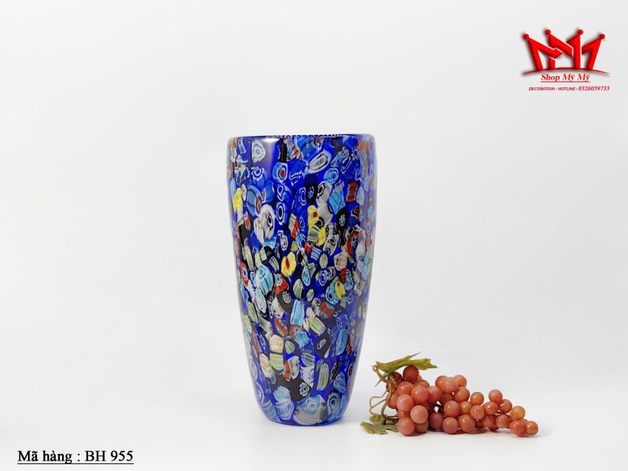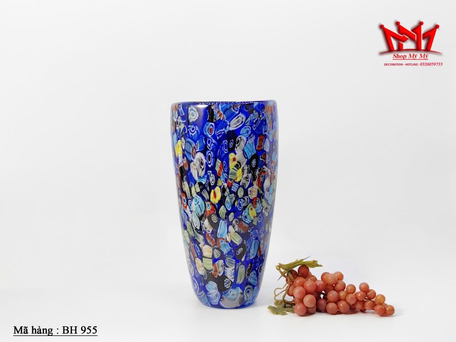Tác phẩm nghệ thuật từ đảo Murano – chiếc bình hoa thủy tinh Millefiori màu xanh lam rực rỡ, được chế tác thủ công với kỹ thuật thổi thủy tinh truyền thống của Ý. Mỗi họa tiết hoa văn nhiều màu sắc là một “dòng chảy nghệ thuật” độc nhất, mang đến vẻ sang trọng và cuốn hút cho không gian sống.