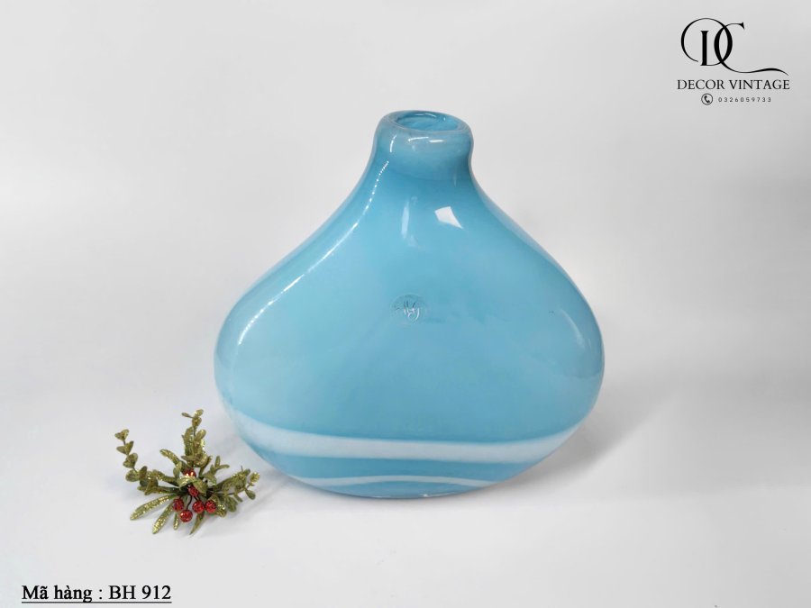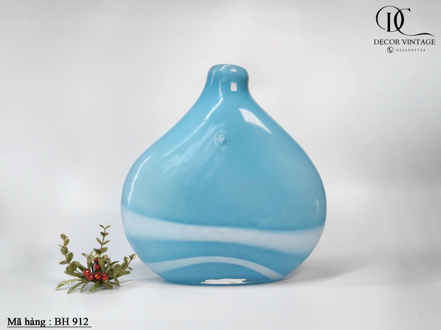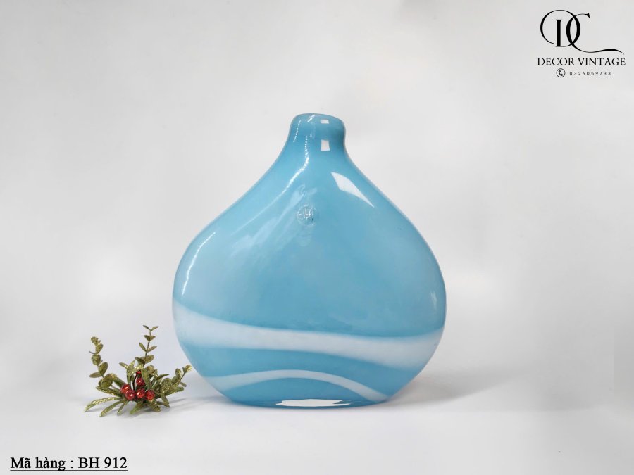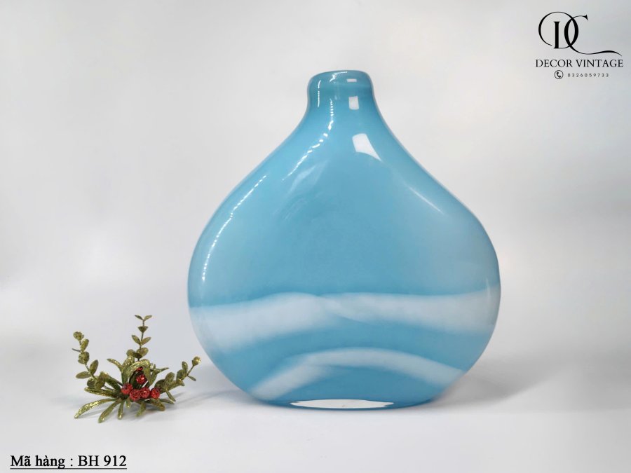Tác phẩm nghệ thuật độc đáo từ thủy tinh cao cấp, được chế tác bằng kỹ thuật thổi thủ công tinh xảo, mang sắc xanh ngọc dịu nhẹ kết hợp dải màu trắng mềm mại như những áng mây. Thiết kế dáng tròn uyển chuyển, hiện đại nhưng vẫn giữ nét mộc mạc, phù hợp với nhiều phong cách trang trí.