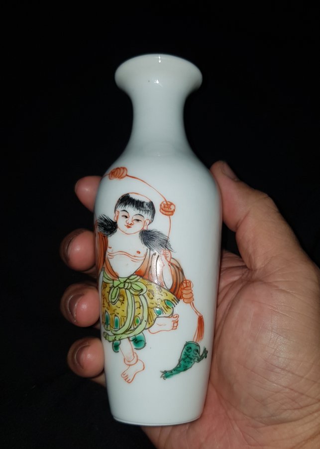 Bình sứ màu mini được nghệ nhân xưa vẽ tay với điển tích Lưu Hải câu cóc , một điển tích phú quý , tài lộc được lưu truyền lâu đời trong nhân gian. Bình cao tổng thể 15.5cm. GL1950k