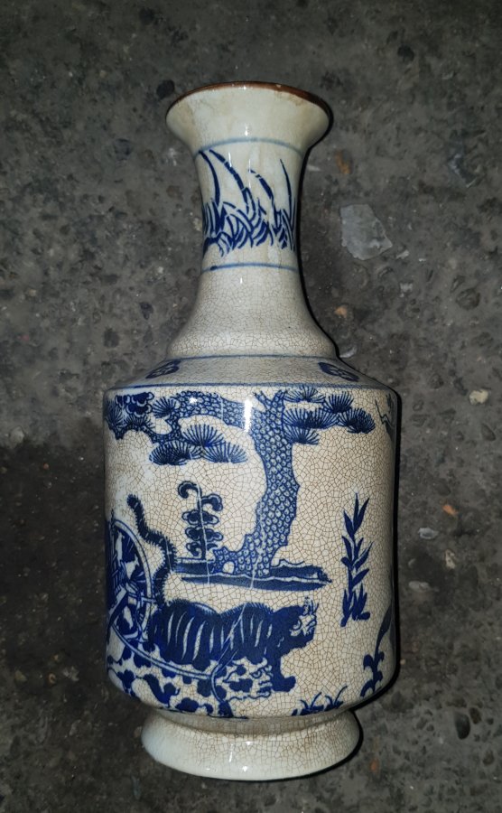 Bình dáng lạ hiếm gặp men rạn hoàn toàn điển tích Quỷ Cốc Tử hạ sơn với chiều cao 23cm. đường kính miệng 5.9cm. vòng bụng 34cm. lành lặn. GL950k