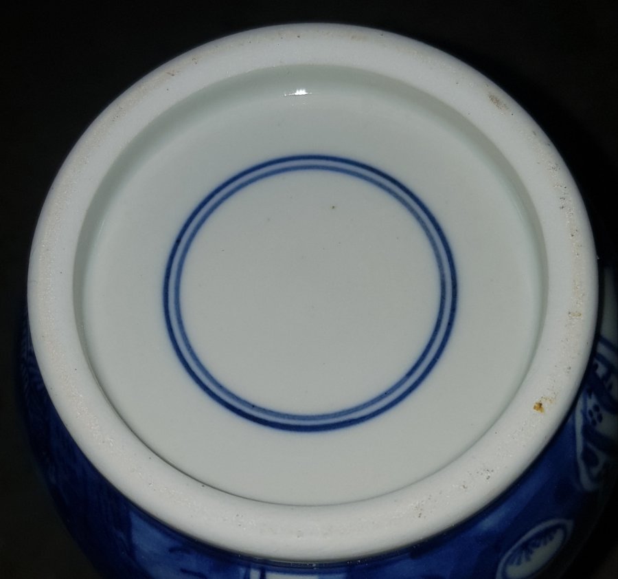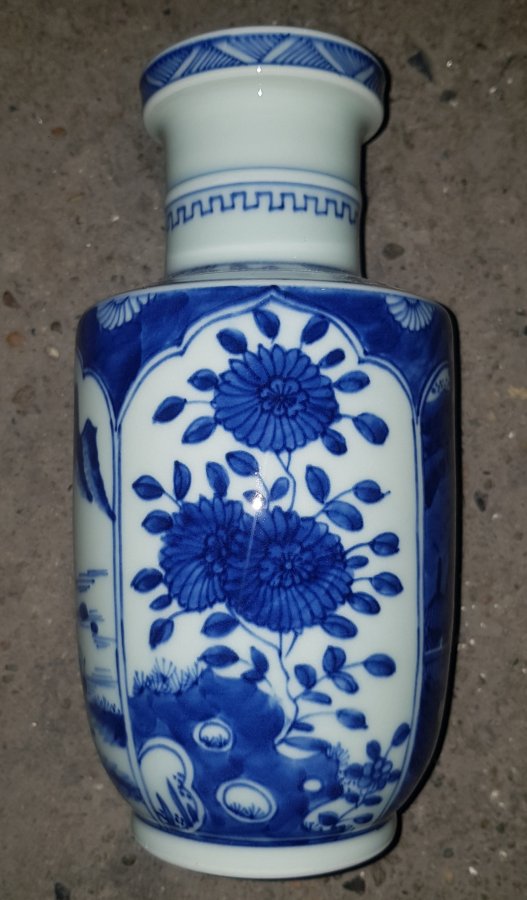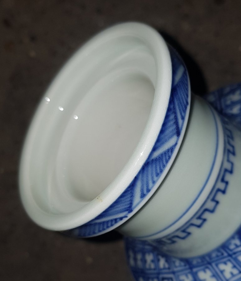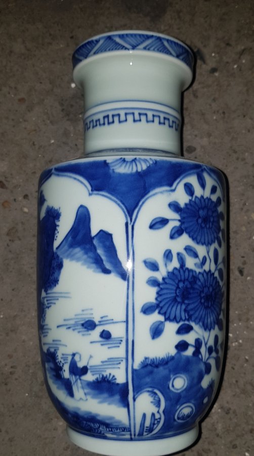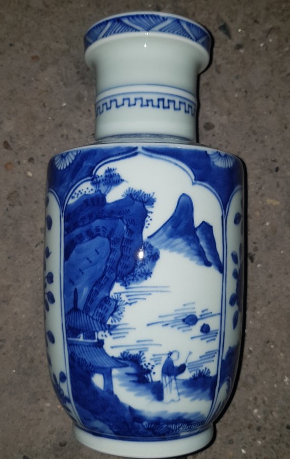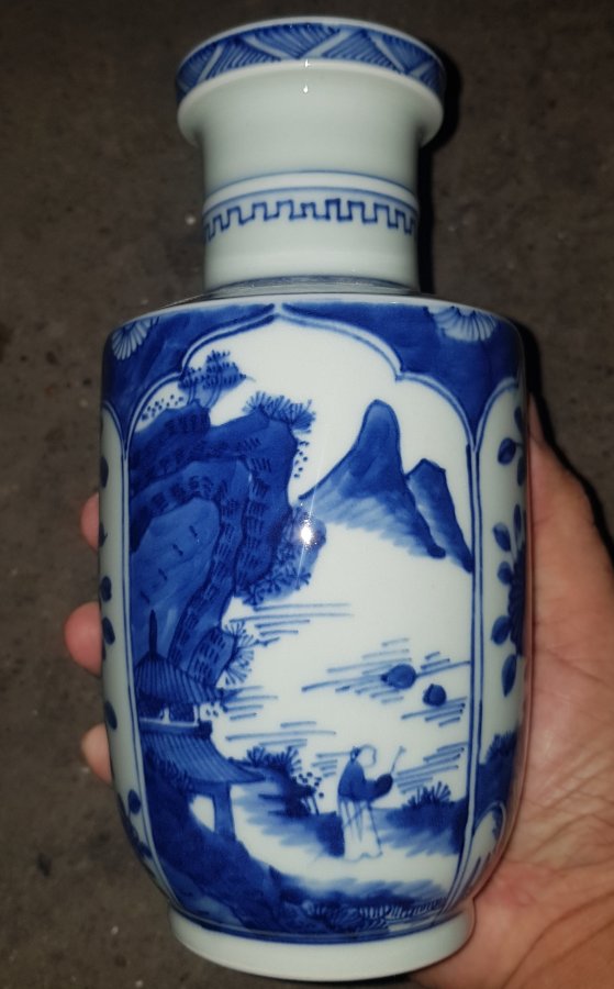 Bình mini cao 22cm dáng ru lô miệng đấu họa pháp bổ ô vẽ Mộc Y Sơn Ông đăng sơn với sắc men lam chàm hồi tươi tắn. GL1250k