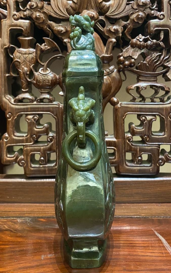 Vì chất Ngọc Bích rất bóng , nên khi lên hình ảnh bị lóa ánh sáng , nhìn thực tế các nét đục chạm nét và thân bình cũng rất nhẵn bóng và đẹp :