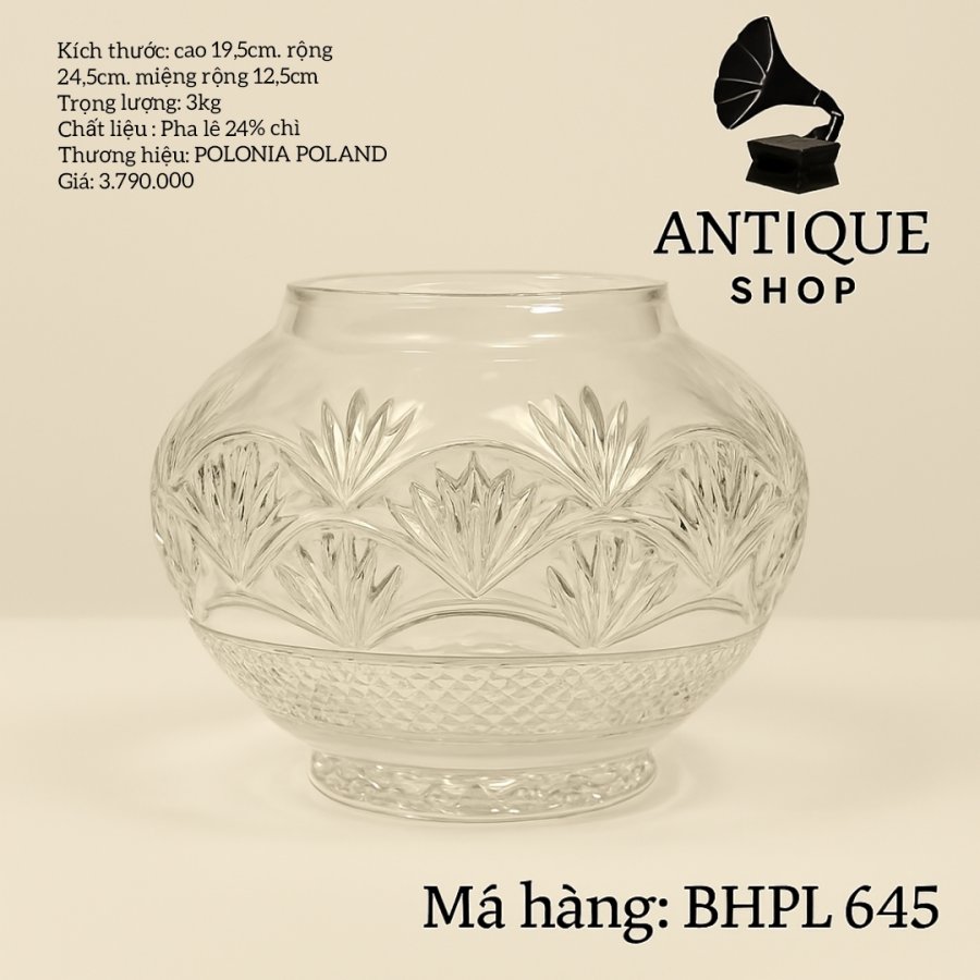 Mã hàng: BHPL 645. Kích thước: cao 19,5cm. rộng 24,5cm. miệng rộng 12,5cm.Trọng lượng: 3kg. Chất liệu : Pha lê 24% chì.Thương hiệu: POLONIA POLAND