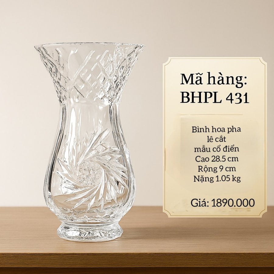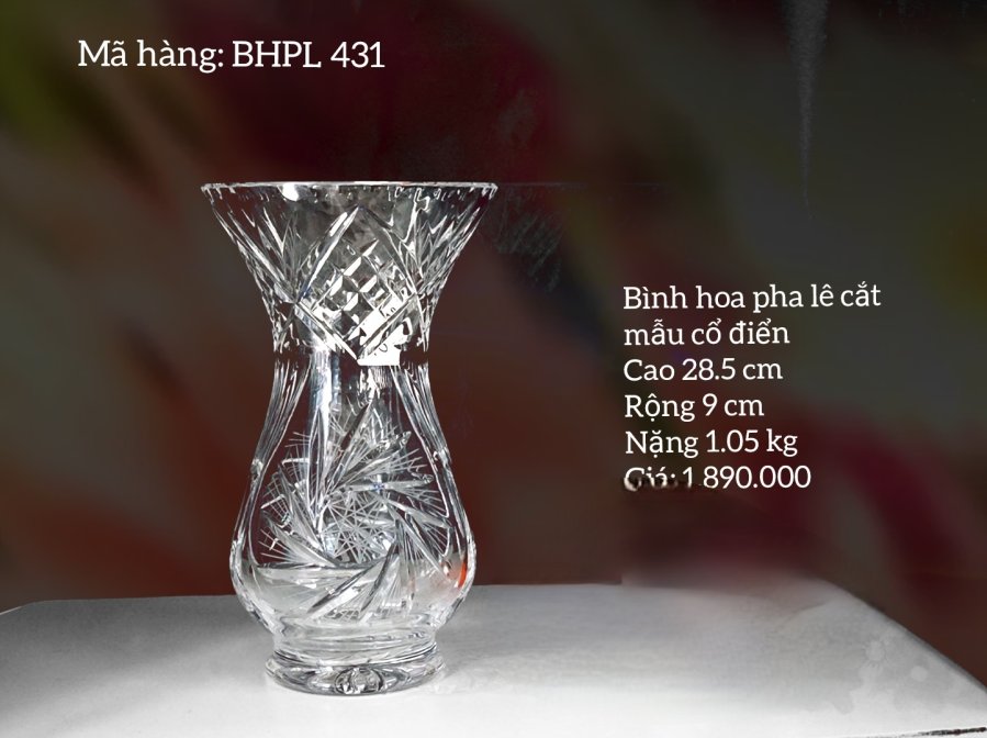 Mã hàng: BHPL 431 .Bình hoa pha lê cắt 24% chì mẫu cổ điển.Cao 28.5 cm.Rộng 9 cm. Nặng 1.05 kg, một chiếc bình pha lê với hoa văn hình ngôi sao phức tạp và đẹp mắt, được mô tả là trong tình trạng tuyệt vời, không có dấu hiệu sứt mẻ, nứt vỡ, hư hỏng, hao mòn hoặc sửa chữa.